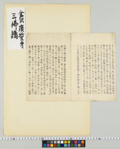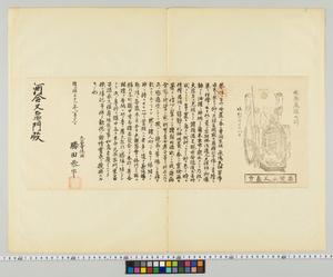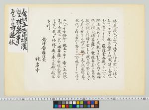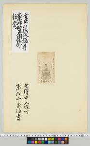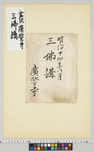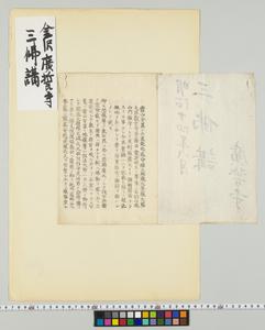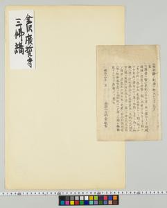 | 内容 | 烏枢沙摩明王(金沢玉竜寺) 源信大師採画山越弥陀如来真影(金沢月照寺) 不動明王(金沢松月寺) 五百羅漢(金沢桂岩寺) 羅漢堂瓦ノ寄進状(金沢桂岩寺) 准胝観音(金沢融山院) 七福神の歌 増田雪巌誌.(金沢宝円寺) 十一面観音 重則追善施与 篠井朝則[著].(金沢真行寺) 運慶作大黒天(金沢真行寺) 行基御作地蔵尊(金沢松山寺) 薬師如来(金沢永福寺) 鉄守薬師如来来歴(金沢永福寺) 十一面観音 運慶作(金沢長谷院) 弁才天像(金沢天徳院) 弁才天尊像(金沢天徳院) 金竜山天徳院之景(金沢天徳院) 金竜山天徳院之図 如春写.(金沢天徳院) 蔵海讃釈尊十六羅漢(金沢天徳院) 観音・鬼子母神(金沢天徳院) 大機讃観世音像(金沢天徳院) 懺悔文・三帰戒・十句観音経 悟由[著].(金沢天徳院) 十重禁戒前宝円玉岡題詠(金沢宝円寺) 西国三十三ケ所(金沢瑞雲寺) 正一位開運稲荷大明神(金沢竜国寺)ほか |