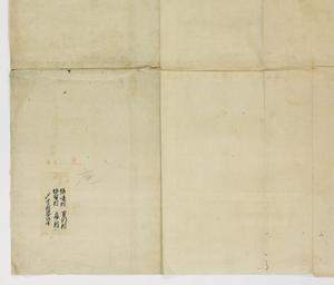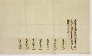 | 作成者 | 加賀藩能登郡佐味村肝煎七郎左衛門・組合頭五右衛門・同宗次郎・同道徳・長百姓宗三郎、万行村肝煎六左衛門・組合頭三右衛門・同助・同四郎左衛門・長百姓左次右衛門、佐野村肝煎弥四郎・組合頭平助・同平左衛門・長百姓半三郎、十村鰀目村太間、十村武部村太郎左衛門、土方領能登郡庵村肝煎弥左衛門・組合頭庄助・同泉・同次郎左近・同久兵衛・同六左衛門・同助・同太郎右衛門・同久左衛門・同助兵衛・同妙林・長百姓安岸、十村庵村五郎左衛門 (裏書)近藤四郎左衛門・原五郎左衛門・菊池十六郎・羽石重兵衛・荒川源兵衛・久米安太夫・桜井又兵衛 |