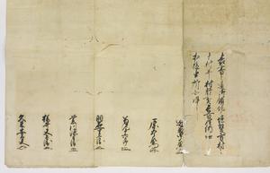 | 作成者 | 加賀藩能登郡菅沢村肝煎谷内兵衛・組合頭助・長百姓六助、須能村肝煎九左衛門・組合頭助太郎・長百姓仁右衛門、麻生村肝煎助五郎・組合頭五郎左衛門・同助兵衛・長百姓仁左衛門、黒崎村肝煎九郎右衛門・組合頭間兵衛・同与三左衛門・長百姓少次、多根村肝煎四位・組合頭中屋・同作左衛門・同三郎右衛門・長百姓次郎左衛門、射水郡平村肝煎安兵衛・組合頭三郎左衛門・長百姓太郎兵衛、吉岡村肝煎仁右衛門・組合頭助十郎・長百姓長左衛門、脇村肝煎喜十郎・組合頭甚九郎・長百姓与七郎、十村武部村太郎左衛門、十村加納村与兵衛、能州石動山天平寺山目代、土方領能登郡熊渕村肝煎弾正・組合頭太郎兵衛・同助・同右近・同孫十郎・長百姓水坪、山崎村肝煎住左衛門・同三左衛門・組合頭次郎九郎・同田中左衛門・長百姓彦左衛門、花園村肝煎右衛門助・組合頭助・長百姓十郎、東浜村肝煎左近・組合頭孫助・同与三次郎・長百姓田幡、大泊村肝煎五次兵衛・同兵衛・組合頭浜左近・同庵室・長百姓左近、十村庵村五郎左衛門 (裏書)近藤四郎左衛門・原五郎左衛門・菊池十六郎・羽石重兵衛・荒川源兵衛・桜井又兵衛・久米安太夫 |