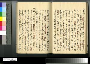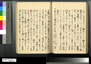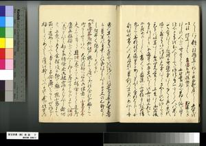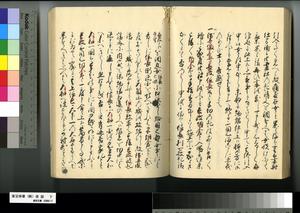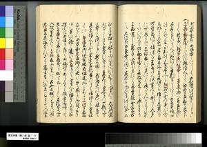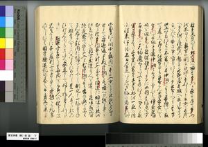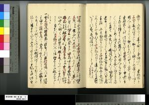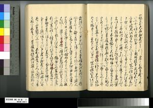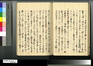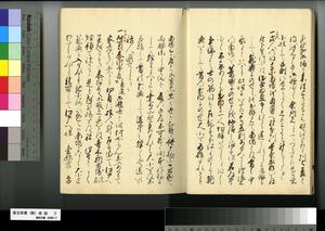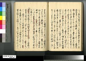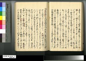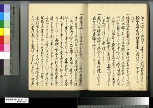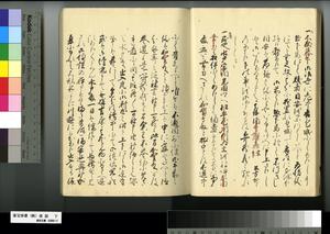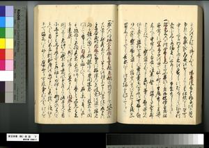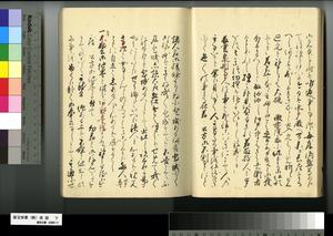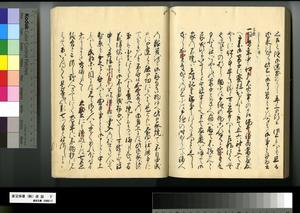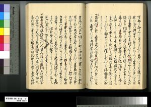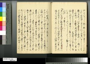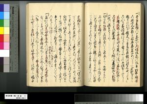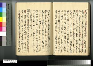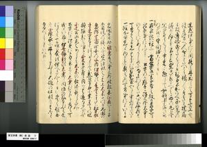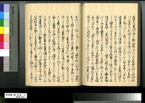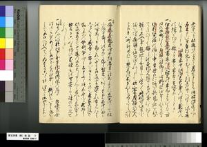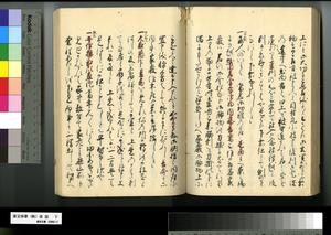 | 解説 | 前田利常・光高に関する説話等を載せたもの。上巻題簽に「原書珎本」と朱書あり。上巻は紹鉄・家厳(今枝近義)・菊池直辰・浅井政右・平井氏・前田直忠・中村与行・木下順菴・宗二・横山長正の談話130ヶ条,下巻は紹鉄・家厳・奥村庸礼・菊池直辰・菊池武康・平井・中村・浅井政右・前田直忠・関屋氏・有沢俊貞の107条を収む。上巻奥書に「寛文十二稔仲秋,二十歳今枝直方自筆」下巻奥書に「寛文十二季仲秋,今枝内記直方自書」とあり。 |