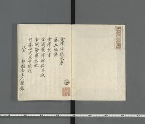 | 解説 | ○金沢神社来歴(森田良見著) 兼六園内にある金沢神社の来歴,その境内にある金洗沢の伝説等を記すもの。明治12年5月,「藤五物語」「金沢紀事」を添えて,金沢神社社殿に納めた。奥書に「右金沢神社来歴并藤五物語・金沢紀事,山納氏二通宛謄写,一通者為巻軸納于神殿,一通者今彼神官天野比良久献呈東京前田家之処,甚被感悦,翌十三年十月金洗沢霊泉碑文石摺二帖被申付,一帖者被納社殿,一帖者賜柿園舎主人也」とあり。 ○藤五物語 ○金沢紀事(文政6年富田景周著) ○金城麗沢碑銘并叙(天保15年津田鳳卿・渡辺栗著) ○金城麗沢碑鐫成蒙賜搨本,謹献蕪詩奉謝左右(市河三亥著) ○金城隆盛私記(元禄15年土屋義休著) 末尾に著者に関する考証を付す。 ○行基山伏見寺縁起(元和3年快存著) 末尾に「右一巻,伏見寺所蔵,明治廿二年八月八日於寺写之」とあり |