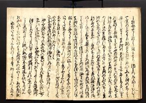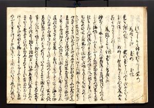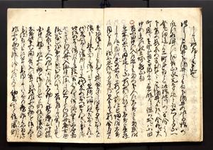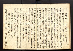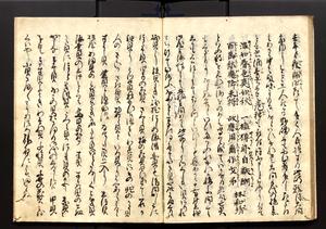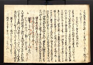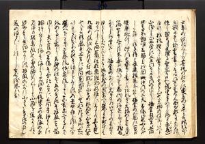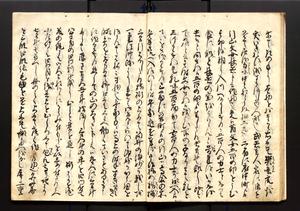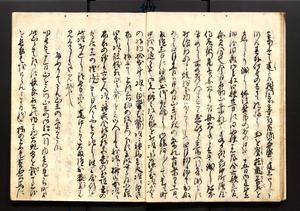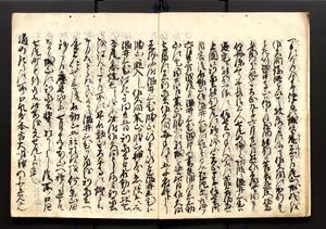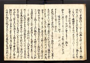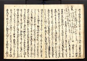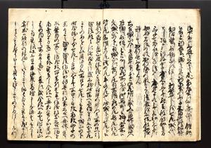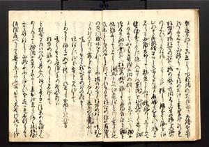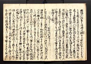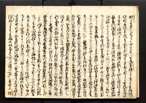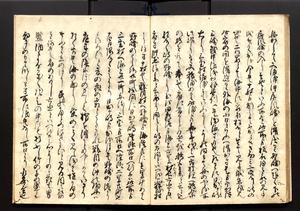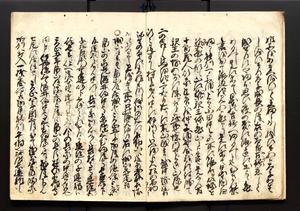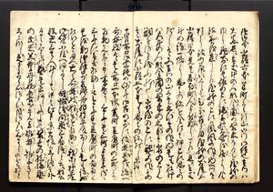 | 解説 | 能州出船御用のため主人中川重直に従って田鶴浜へ出張した時の紀行。「能州之図」(No.274)を付す。末尾に1丁を付し,本書と絵図を収めていた袋の上書を良見が書写し,「丁酉能州口郡内浦於出船所,諸事覚書之反古取集,又反古之裏綴之,併古戦触于世所書物,或板本或写本等之内也但異本異説数多除之,又咄其所之者之依口出所,地景・名物等所見聞也,就中連歌・俳諧・狂歌,両度神輿行烈,同歌舞伎,引山躰,端午乃保利絵,野崎貝揃,童蒙笑草書入,見人除之,道程・町間依公用記,後人可用是而已,外小図一校,山川海陸之有様,物語便添之,九牛一毛乎,享保二年八月下旬,湯桶入湯之隙誌之,森田小兵衛盛昌」とあり。 |
