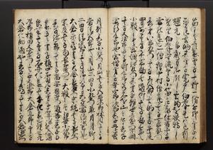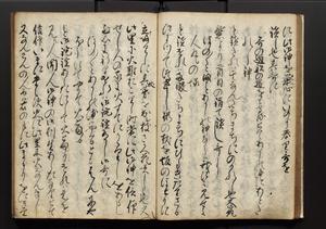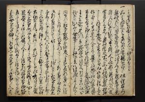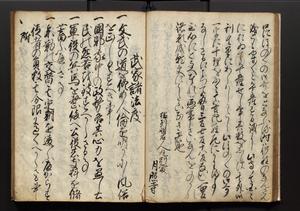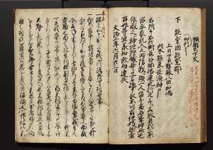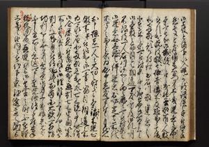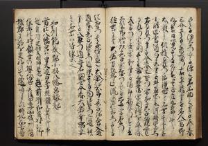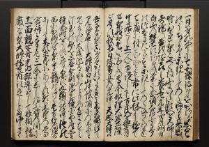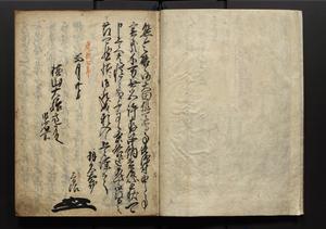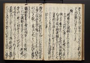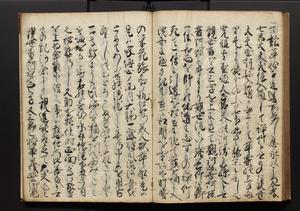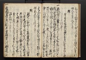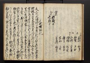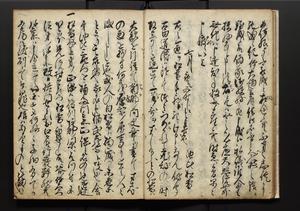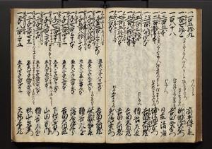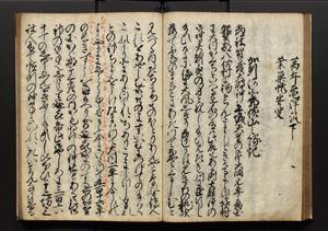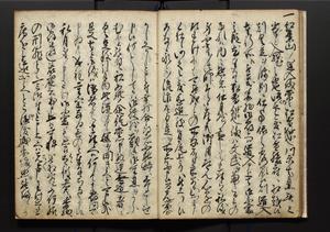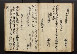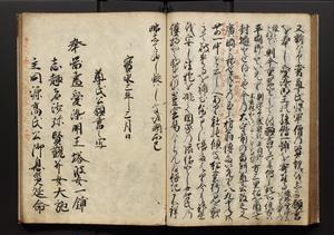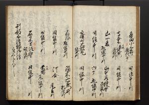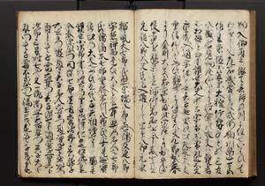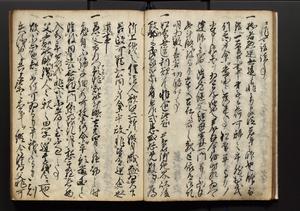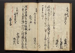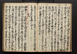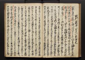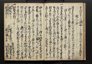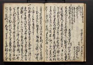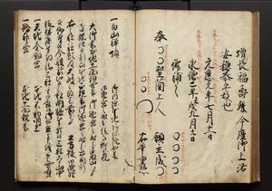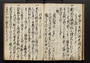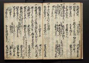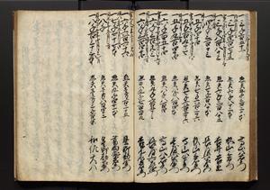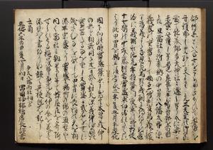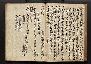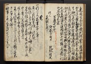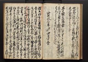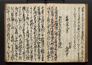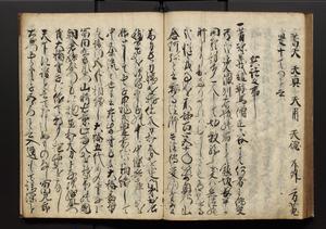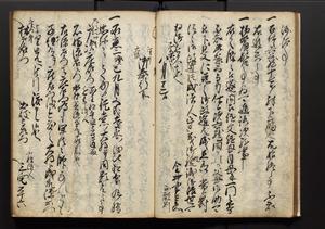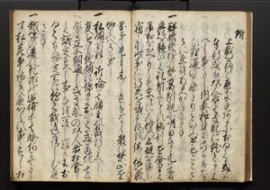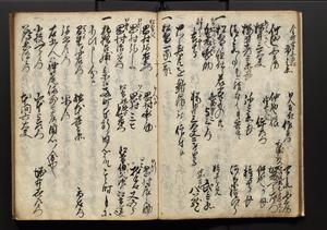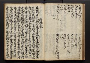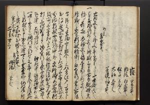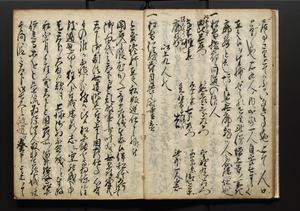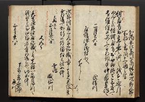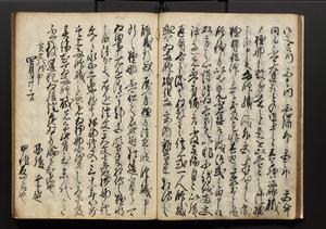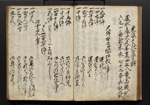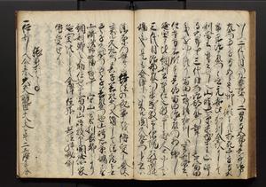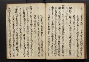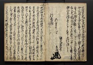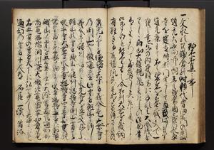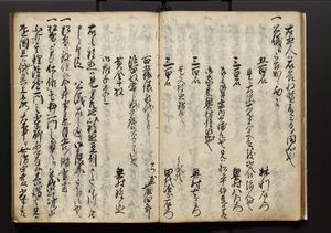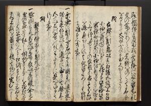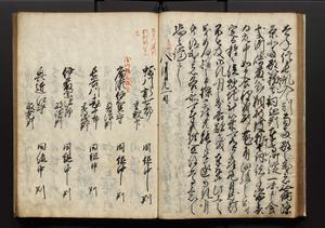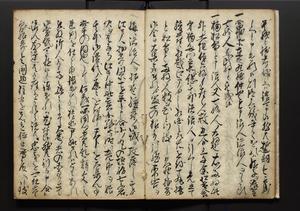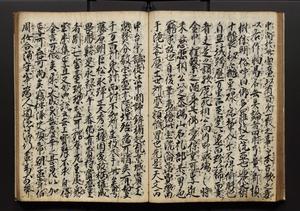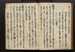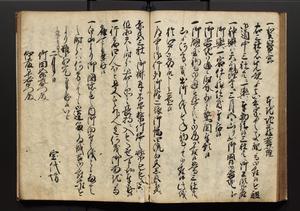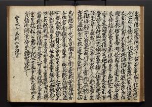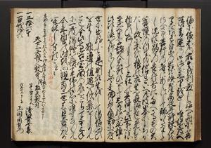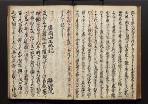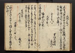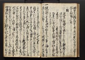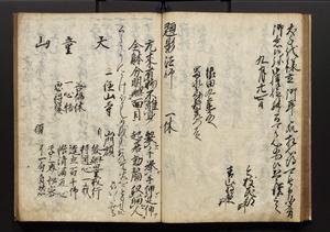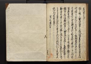 | 解説 | 盛昌座右の雑記録で元禄~享保年間に採録したもの。末尾に2丁を付し「右漸得雑記全部二十六冊旧表紙朱禅寺紙,吾家四世小兵衛盛昌老名西岸大人,在世中座右之雑誌抄録也,蓋元禄・宝永・正徳・享保之年間,所被渉猟之書籍之抄出,或古文書・雑記之写,或故人之伝話,其時々記載焉,其手跡者,長男五世常昌老名定運大人,曁次子勘蔵,三子多四郎,皆未幼年輩,依親父家厳之命令謄写乎,故誤字脱誤不少矣,実吾家伝書中之一部也,但経年暦虫害頗多,且表紙甚破壊,故今自加修繕,改表紙,子孫永世為家珎可令保護者也,明治十年春三月下旬,十世孫紀良見識之」とあり。第1冊表紙に「家伝書」の押紙あり。 |