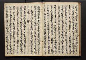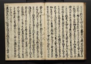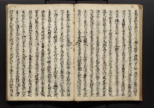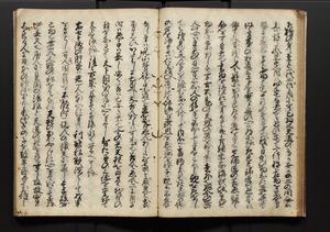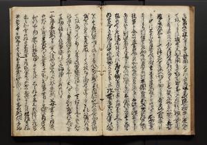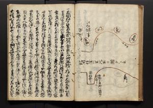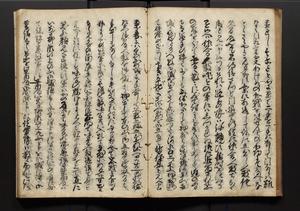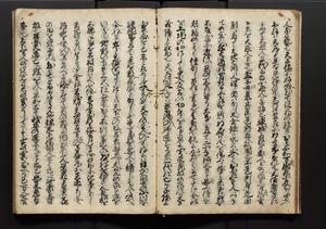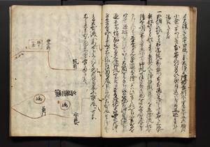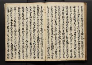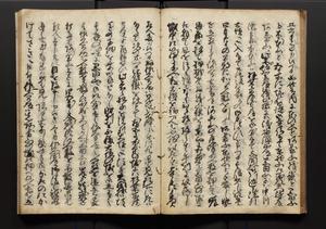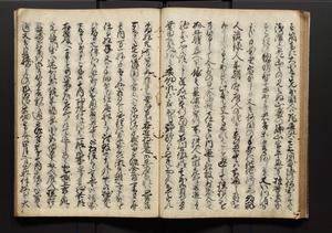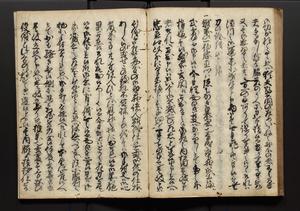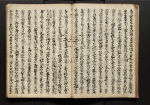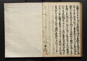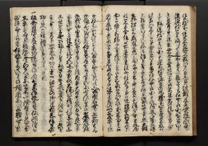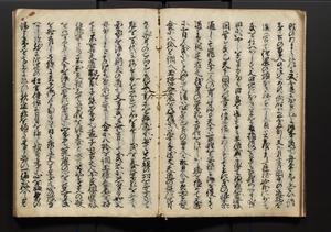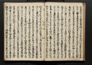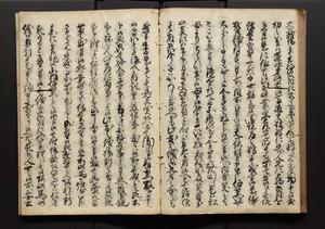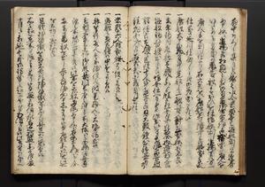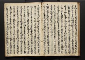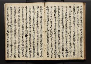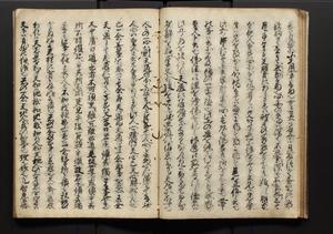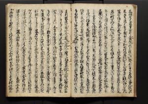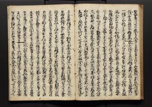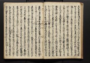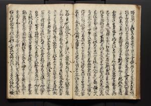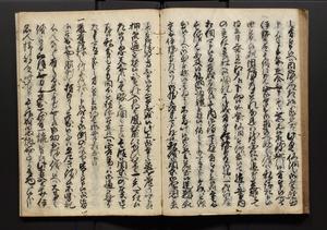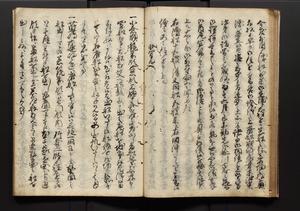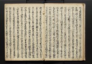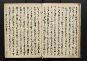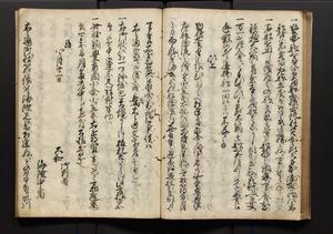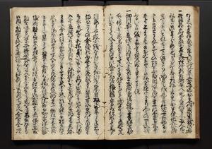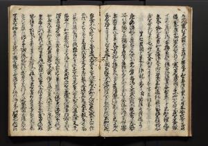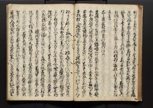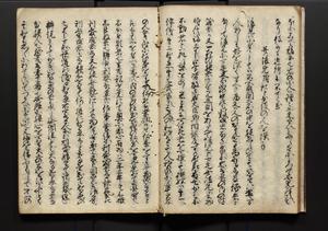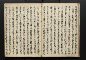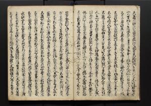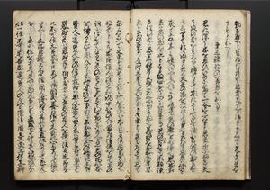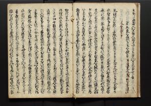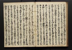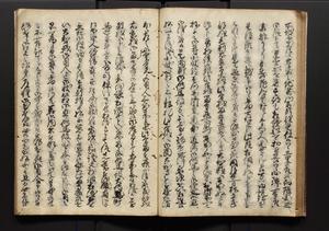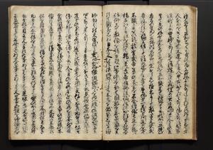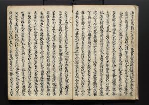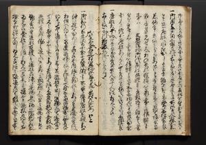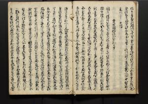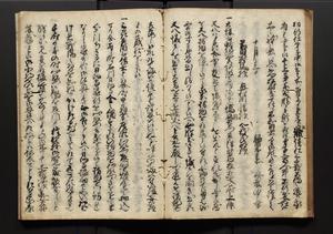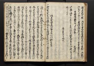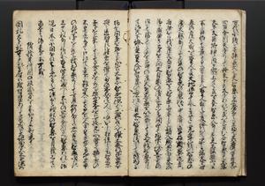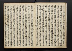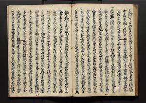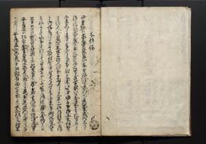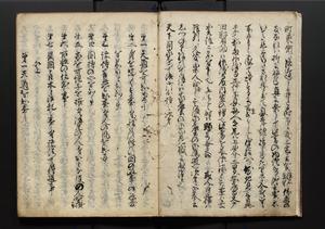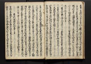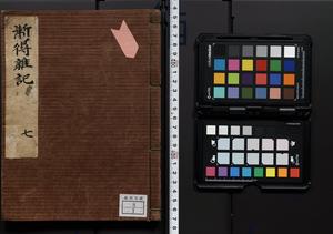 | 解説 | 盛昌座右の雑記録で元禄~享保年間に採録したもの。末尾に2丁を付し「右漸得雑記全部二十六冊旧表紙朱禅寺紙,吾家四世小兵衛盛昌老名西岸大人,在世中座右之雑誌抄録也,蓋元禄・宝永・正徳・享保之年間,所被渉猟之書籍之抄出,或古文書・雑記之写,或故人之伝話,其時々記載焉,其手跡者,長男五世常昌老名定運大人,曁次子勘蔵,三子多四郎,皆未幼年輩,依親父家厳之命令謄写乎,故誤字脱誤不少矣,実吾家伝書中之一部也,但経年暦虫害頗多,且表紙甚破壊,故今自加修繕,改表紙,子孫永世為家珎可令保護者也,明治十年春三月下旬,十世孫紀良見識之」とあり。第1冊表紙に「家伝書」の押紙あり。 |