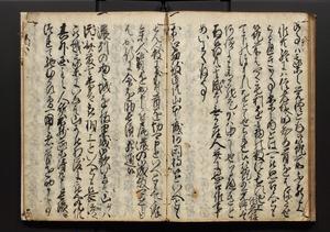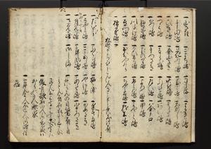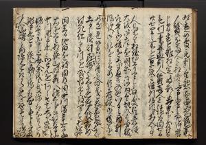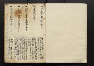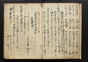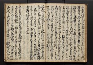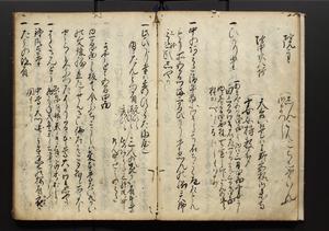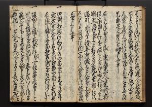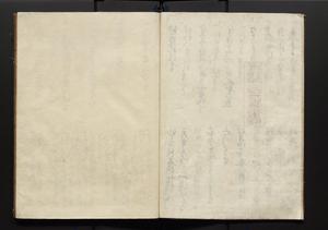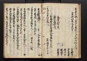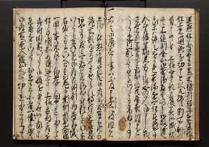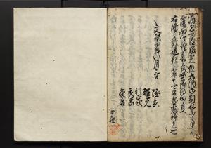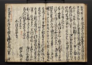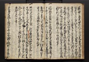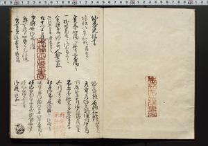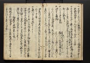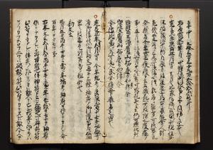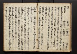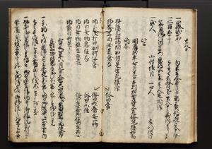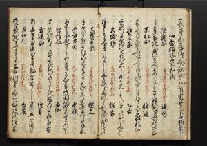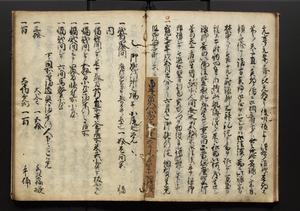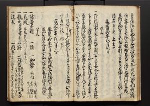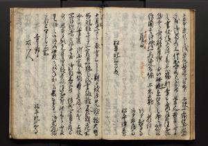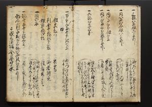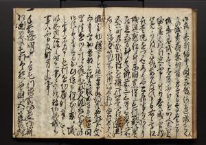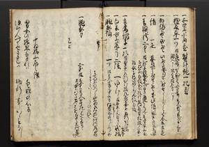 | 解説 | 盛昌座右の雑記録で元禄~享保年間に採録したもの。末尾に2丁を付し「右漸得雑記全部二十六冊旧表紙朱禅寺紙,吾家四世小兵衛盛昌老名西岸大人,在世中座右之雑誌抄録也,蓋元禄・宝永・正徳・享保之年間,所被渉猟之書籍之抄出,或古文書・雑記之写,或故人之伝話,其時々記載焉,其手跡者,長男五世常昌老名定運大人,曁次子勘蔵,三子多四郎,皆未幼年輩,依親父家厳之命令謄写乎,故誤字脱誤不少矣,実吾家伝書中之一部也,但経年暦虫害頗多,且表紙甚破壊,故今自加修繕,改表紙,子孫永世為家珎可令保護者也,明治十年春三月下旬,十世孫紀良見識之」とあり。第1冊表紙に「家伝書」の押紙あり。 |