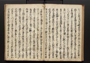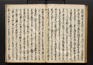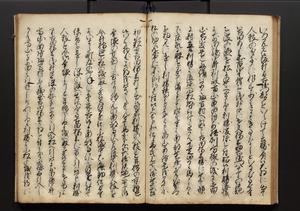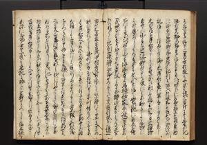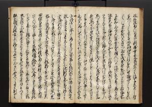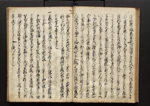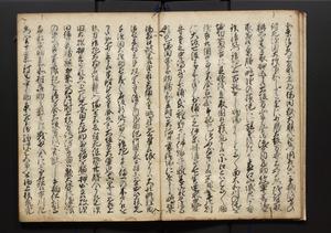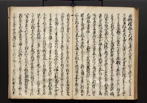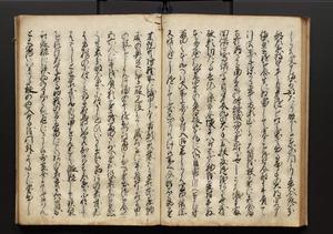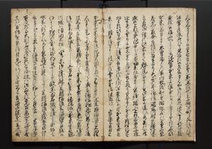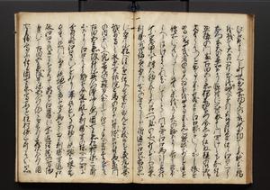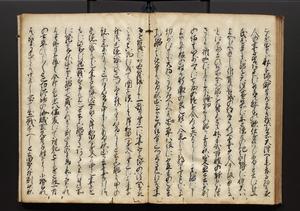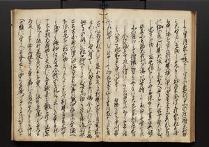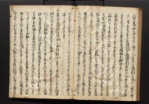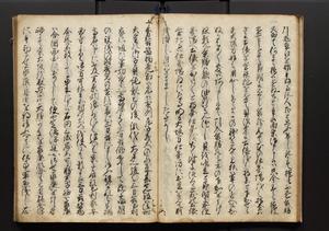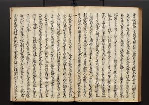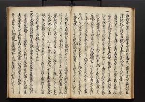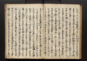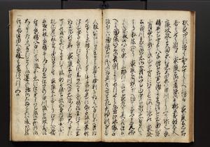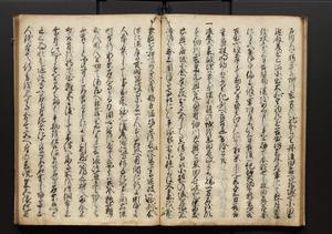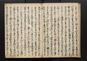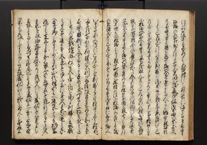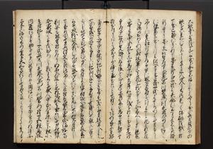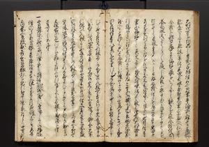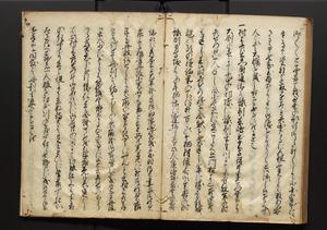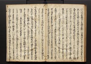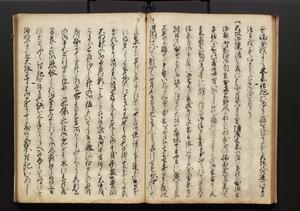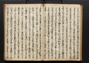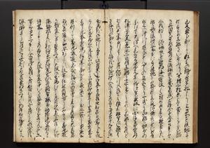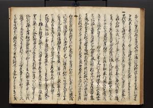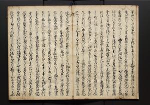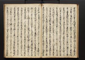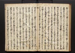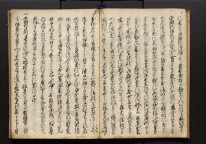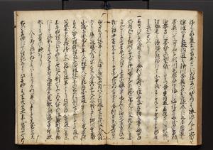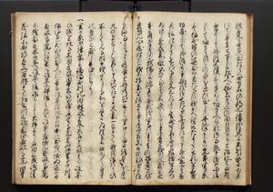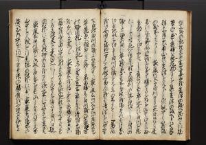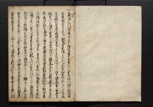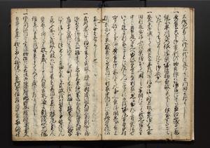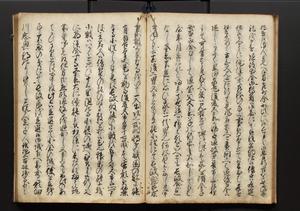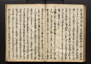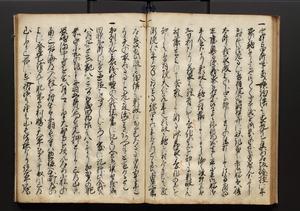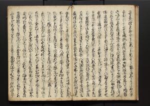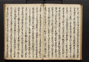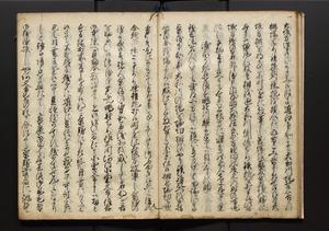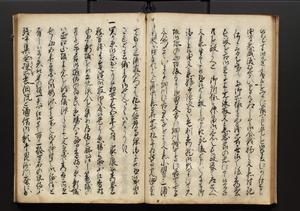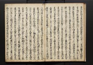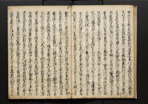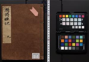 | 解説 | 盛昌座右の雑記録で元禄~享保年間に採録したもの。末尾に2丁を付し「右漸得雑記全部二十六冊旧表紙朱禅寺紙,吾家四世小兵衛盛昌老名西岸大人,在世中座右之雑誌抄録也,蓋元禄・宝永・正徳・享保之年間,所被渉猟之書籍之抄出,或古文書・雑記之写,或故人之伝話,其時々記載焉,其手跡者,長男五世常昌老名定運大人,曁次子勘蔵,三子多四郎,皆未幼年輩,依親父家厳之命令謄写乎,故誤字脱誤不少矣,実吾家伝書中之一部也,但経年暦虫害頗多,且表紙甚破壊,故今自加修繕,改表紙,子孫永世為家珎可令保護者也,明治十年春三月下旬,十世孫紀良見識之」とあり。第1冊表紙に「家伝書」の押紙あり。 |