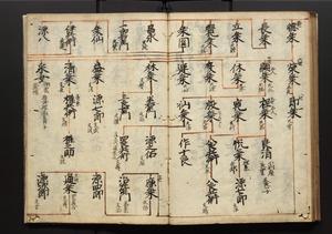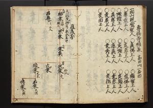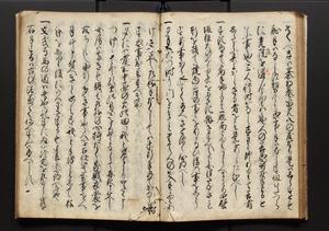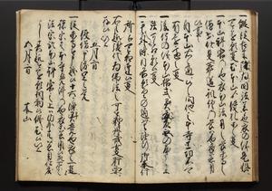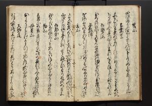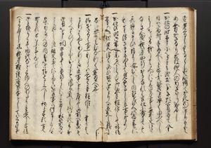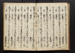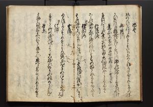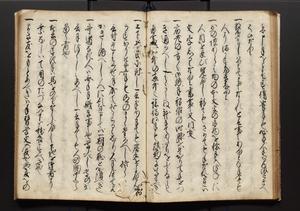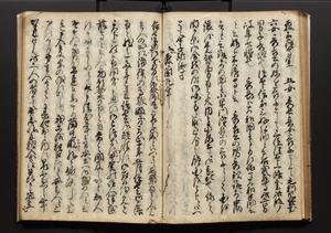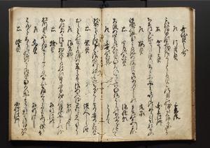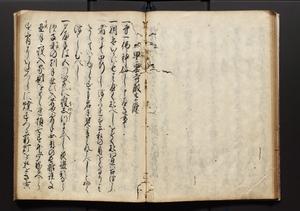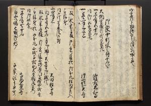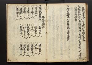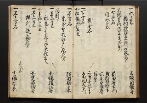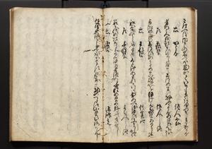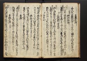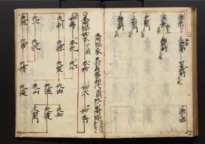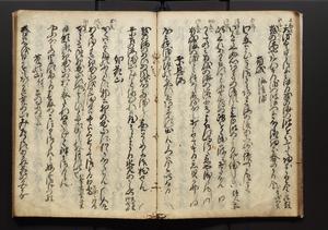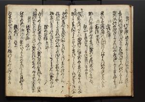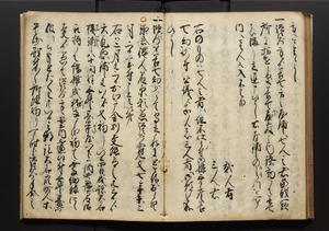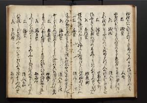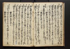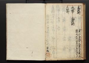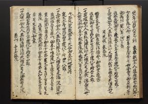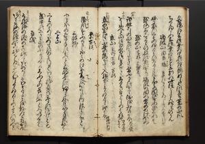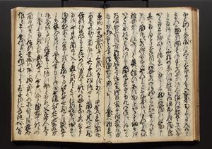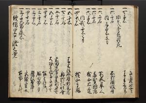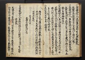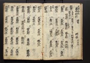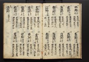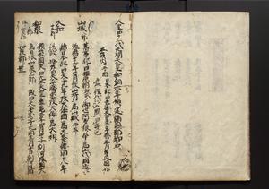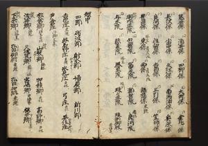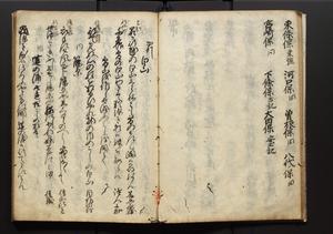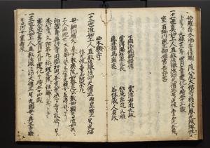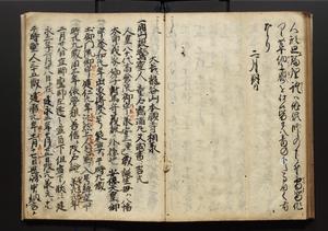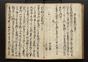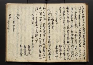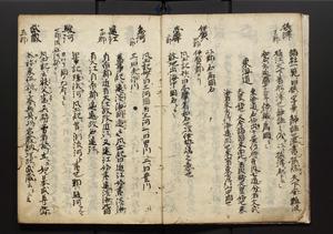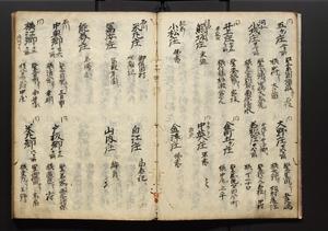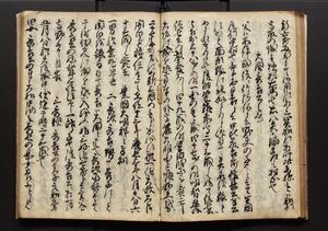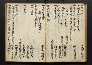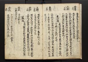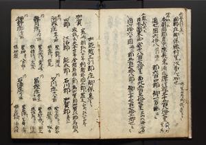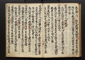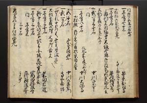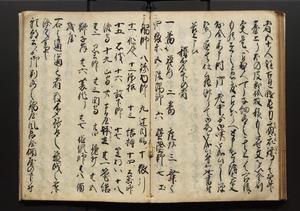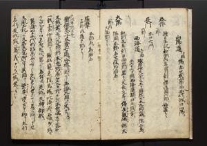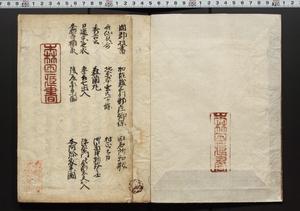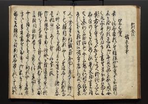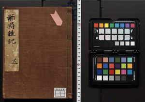 | 解説 | 盛昌座右の雑記録で元禄~享保年間に採録したもの。末尾に2丁を付し「右漸得雑記全部二十六冊旧表紙朱禅寺紙,吾家四世小兵衛盛昌老名西岸大人,在世中座右之雑誌抄録也,蓋元禄・宝永・正徳・享保之年間,所被渉猟之書籍之抄出,或古文書・雑記之写,或故人之伝話,其時々記載焉,其手跡者,長男五世常昌老名定運大人,曁次子勘蔵,三子多四郎,皆未幼年輩,依親父家厳之命令謄写乎,故誤字脱誤不少矣,実吾家伝書中之一部也,但経年暦虫害頗多,且表紙甚破壊,故今自加修繕,改表紙,子孫永世為家珎可令保護者也,明治十年春三月下旬,十世孫紀良見識之」とあり。第1冊表紙に「家伝書」の押紙あり。 |