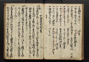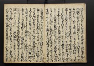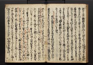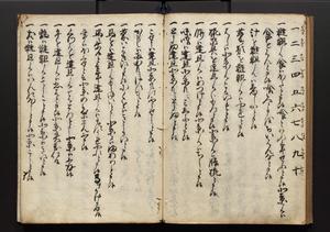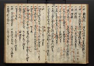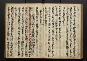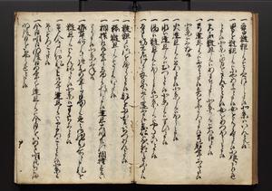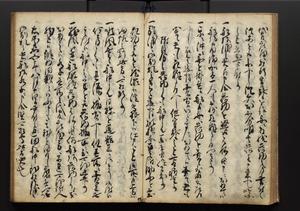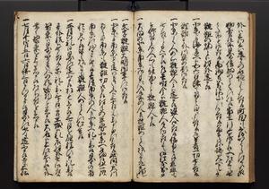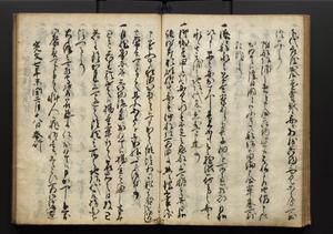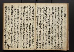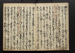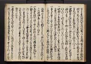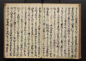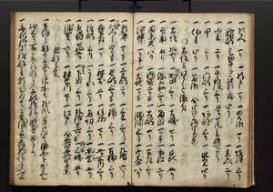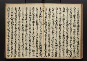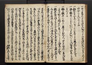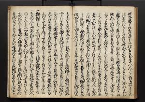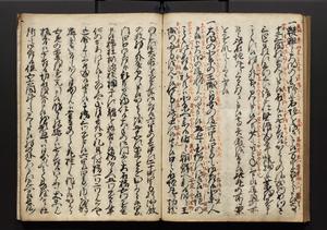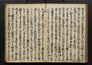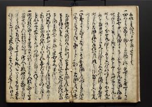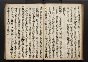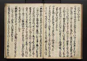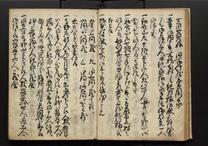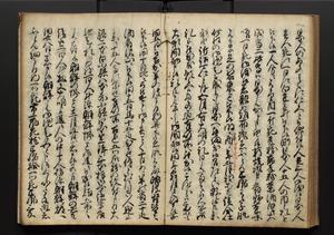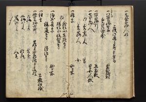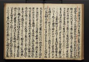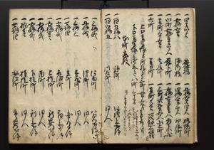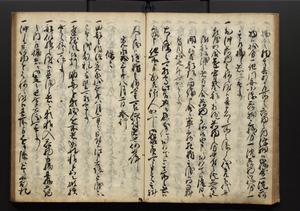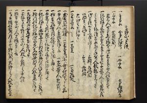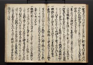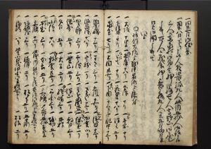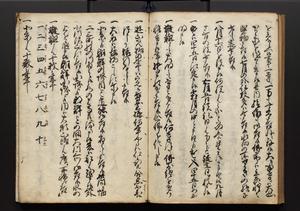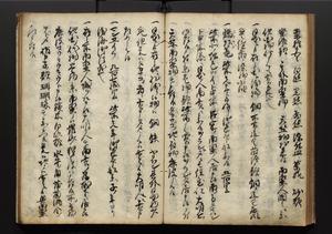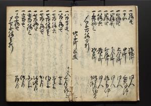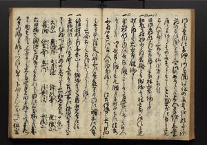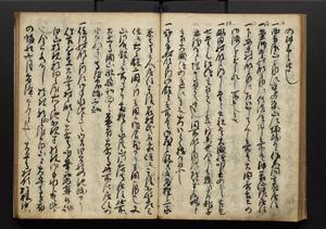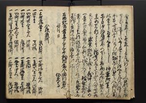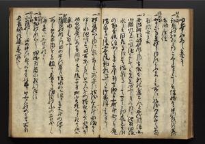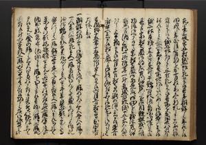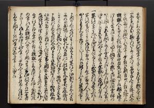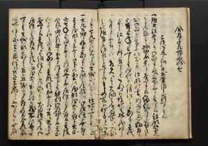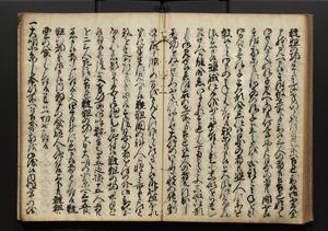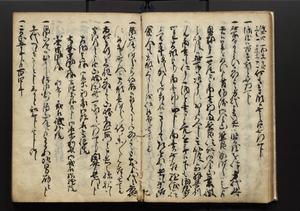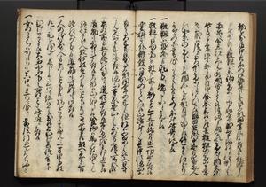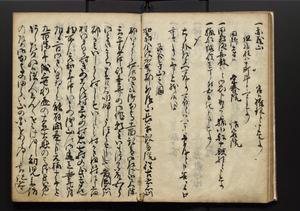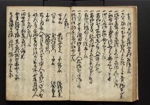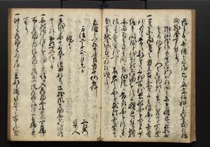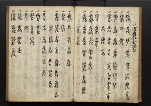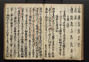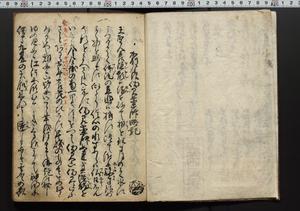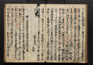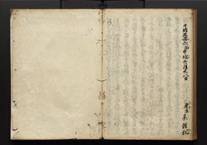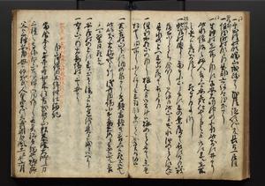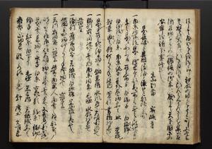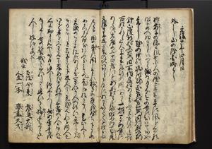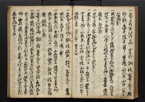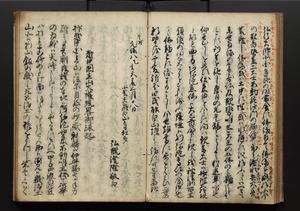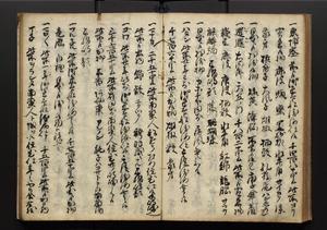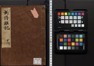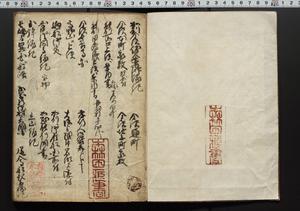 | 解説 | 盛昌座右の雑記録で元禄~享保年間に採録したもの。末尾に2丁を付し「右漸得雑記全部二十六冊旧表紙朱禅寺紙,吾家四世小兵衛盛昌老名西岸大人,在世中座右之雑誌抄録也,蓋元禄・宝永・正徳・享保之年間,所被渉猟之書籍之抄出,或古文書・雑記之写,或故人之伝話,其時々記載焉,其手跡者,長男五世常昌老名定運大人,曁次子勘蔵,三子多四郎,皆未幼年輩,依親父家厳之命令謄写乎,故誤字脱誤不少矣,実吾家伝書中之一部也,但経年暦虫害頗多,且表紙甚破壊,故今自加修繕,改表紙,子孫永世為家珎可令保護者也,明治十年春三月下旬,十世孫紀良見識之」とあり。第1冊表紙に「家伝書」の押紙あり。 |