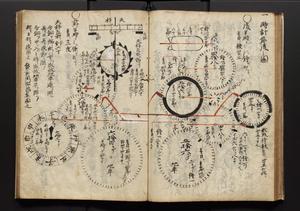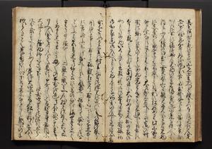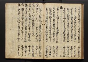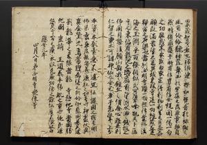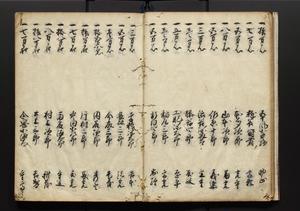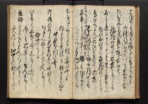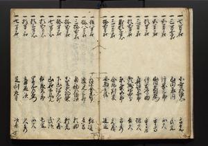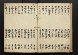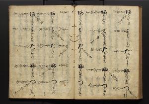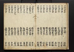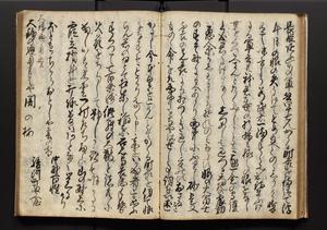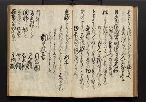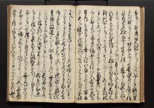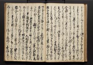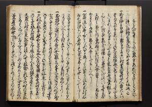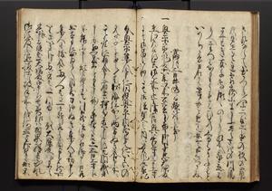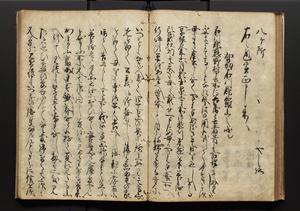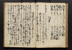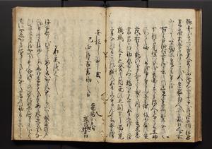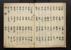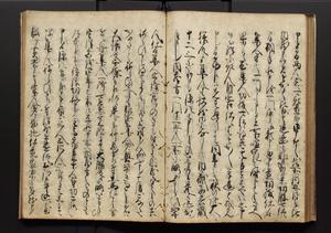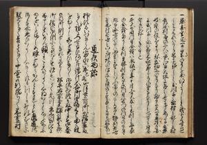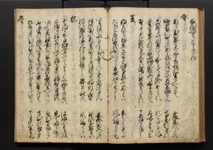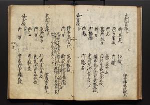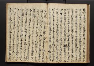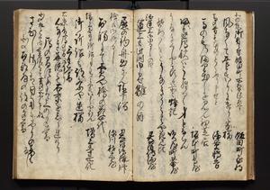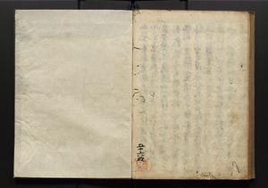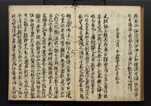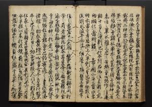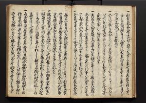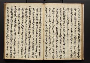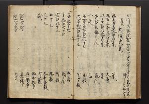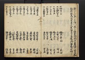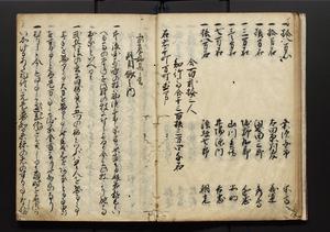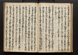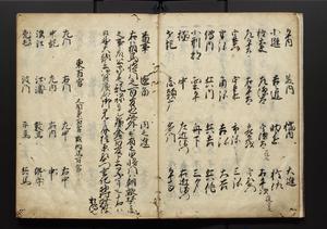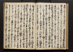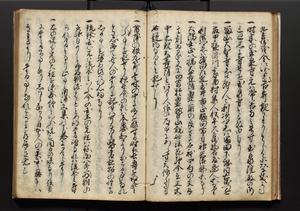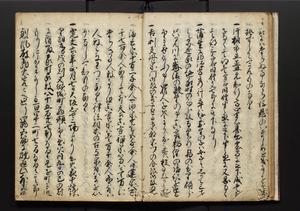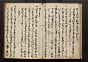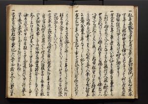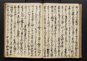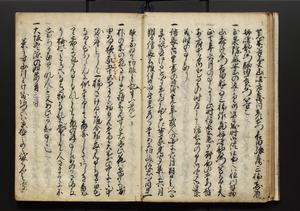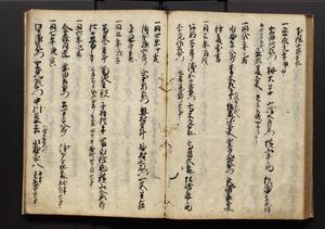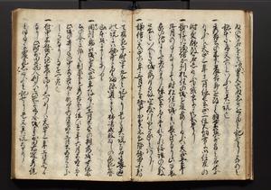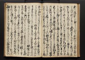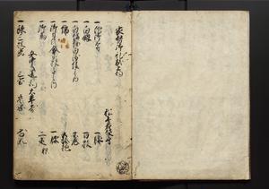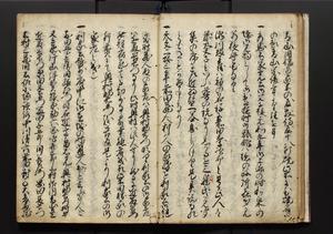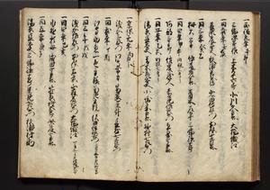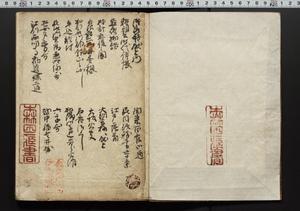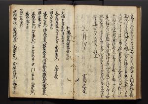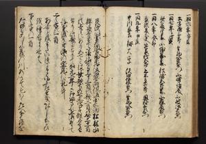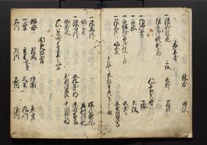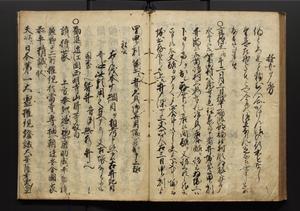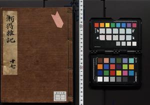 | 解説 | 盛昌座右の雑記録で元禄~享保年間に採録したもの。末尾に2丁を付し「右漸得雑記全部二十六冊旧表紙朱禅寺紙,吾家四世小兵衛盛昌老名西岸大人,在世中座右之雑誌抄録也,蓋元禄・宝永・正徳・享保之年間,所被渉猟之書籍之抄出,或古文書・雑記之写,或故人之伝話,其時々記載焉,其手跡者,長男五世常昌老名定運大人,曁次子勘蔵,三子多四郎,皆未幼年輩,依親父家厳之命令謄写乎,故誤字脱誤不少矣,実吾家伝書中之一部也,但経年暦虫害頗多,且表紙甚破壊,故今自加修繕,改表紙,子孫永世為家珎可令保護者也,明治十年春三月下旬,十世孫紀良見識之」とあり。第1冊表紙に「家伝書」の押紙あり。 |