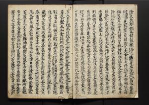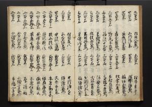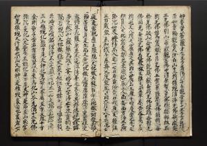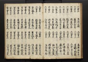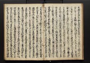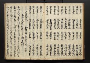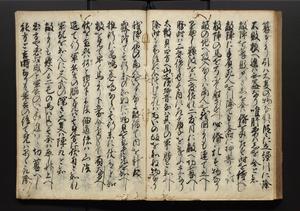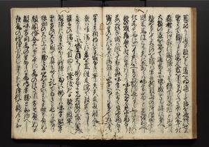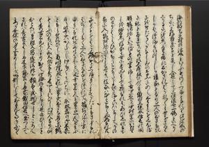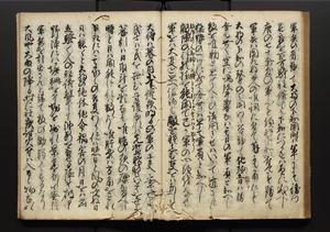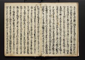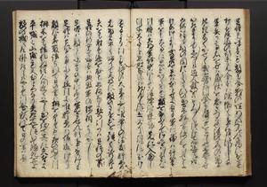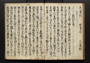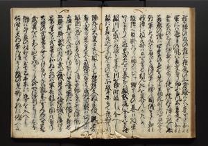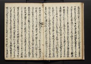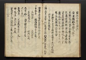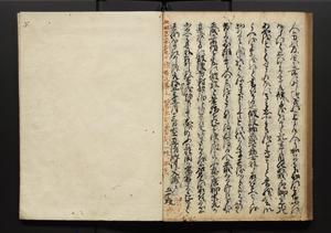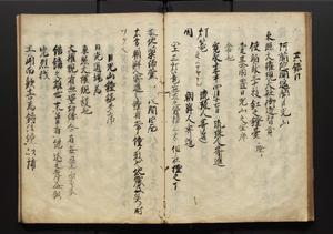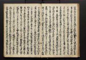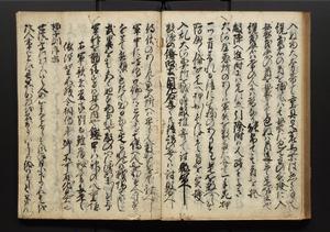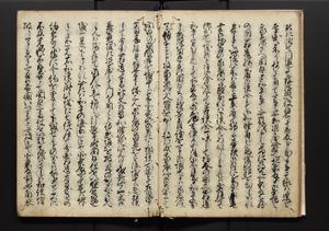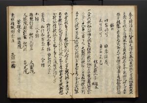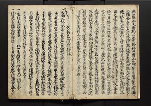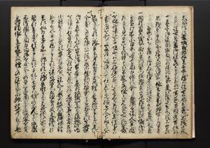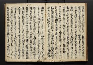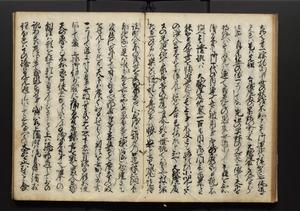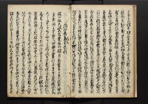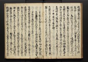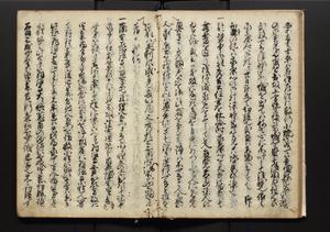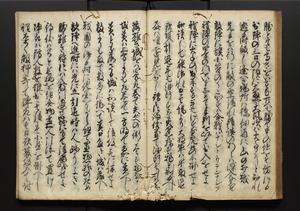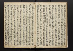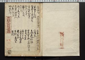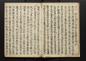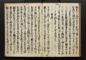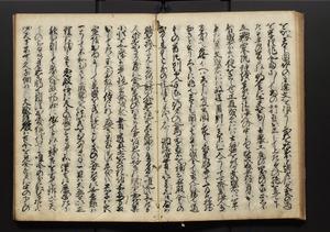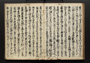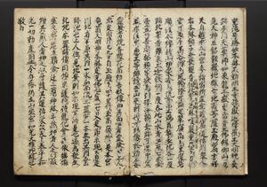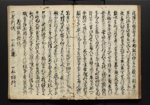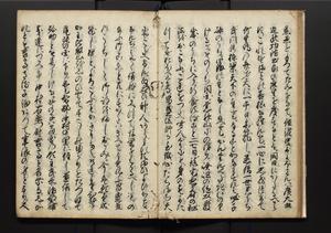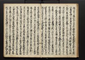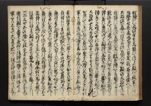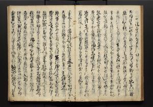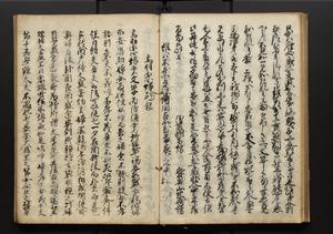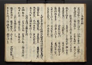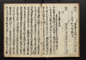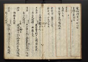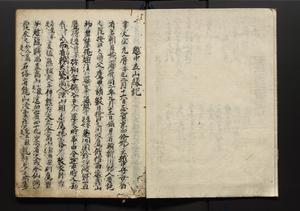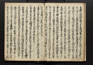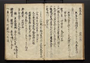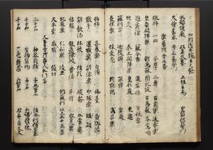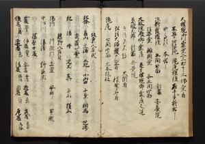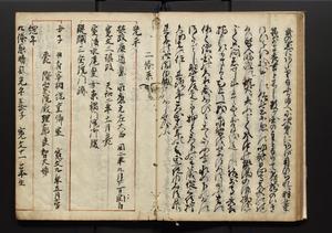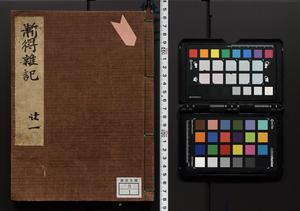 | 解説 | 盛昌座右の雑記録で元禄~享保年間に採録したもの。末尾に2丁を付し「右漸得雑記全部二十六冊旧表紙朱禅寺紙,吾家四世小兵衛盛昌老名西岸大人,在世中座右之雑誌抄録也,蓋元禄・宝永・正徳・享保之年間,所被渉猟之書籍之抄出,或古文書・雑記之写,或故人之伝話,其時々記載焉,其手跡者,長男五世常昌老名定運大人,曁次子勘蔵,三子多四郎,皆未幼年輩,依親父家厳之命令謄写乎,故誤字脱誤不少矣,実吾家伝書中之一部也,但経年暦虫害頗多,且表紙甚破壊,故今自加修繕,改表紙,子孫永世為家珎可令保護者也,明治十年春三月下旬,十世孫紀良見識之」とあり。第1冊表紙に「家伝書」の押紙あり。 |