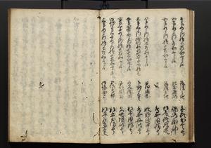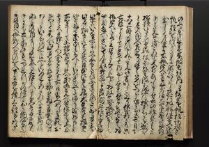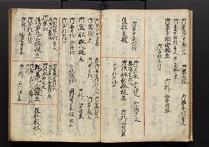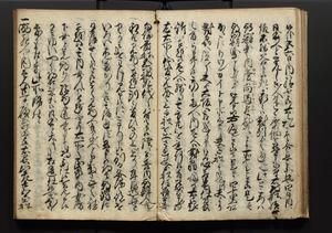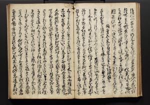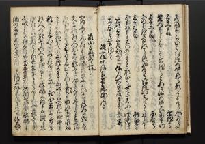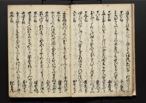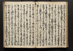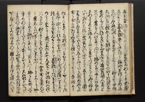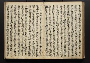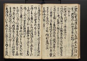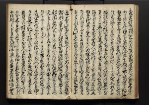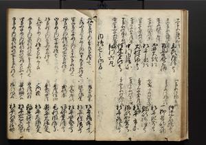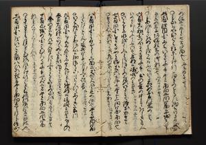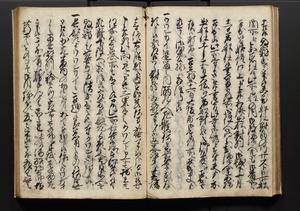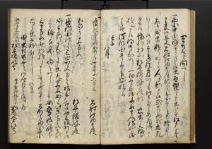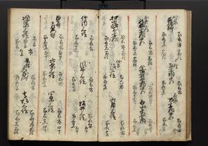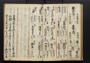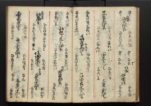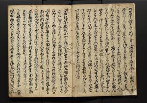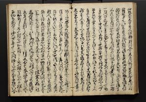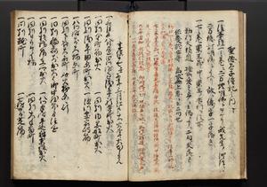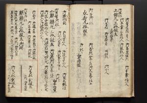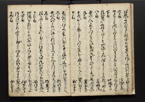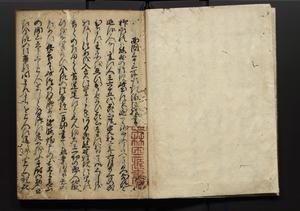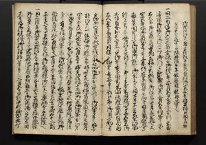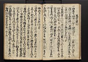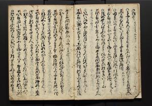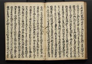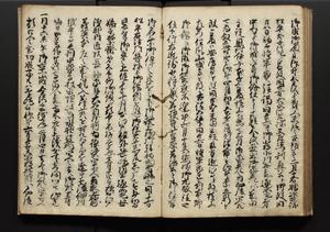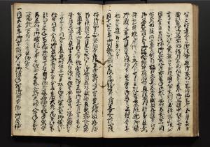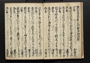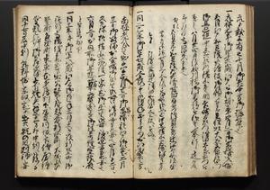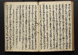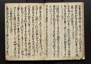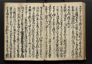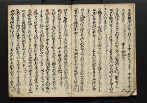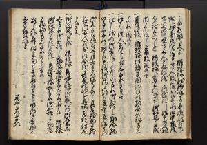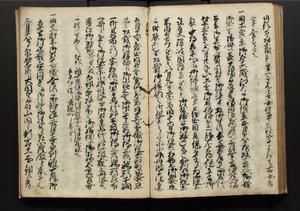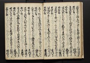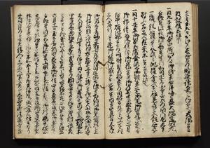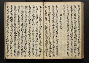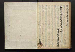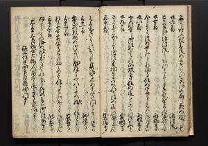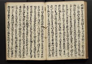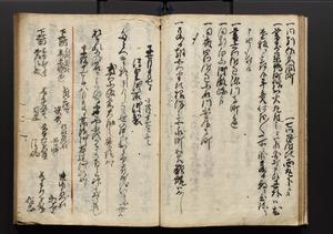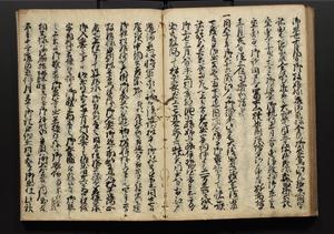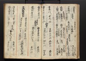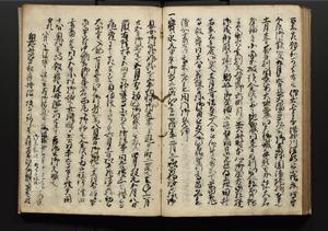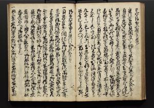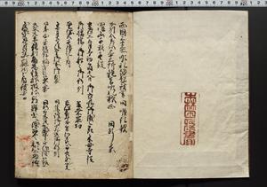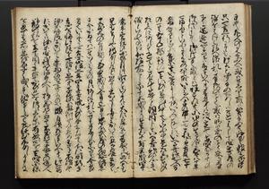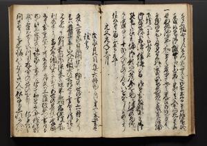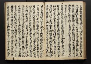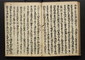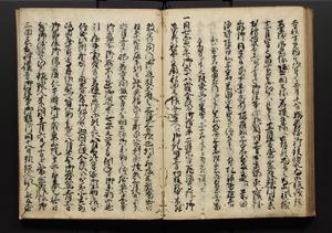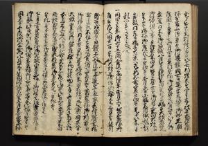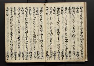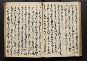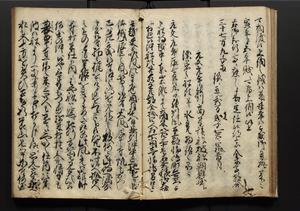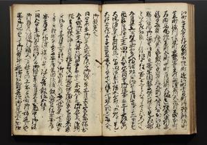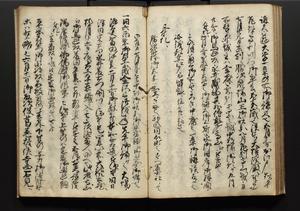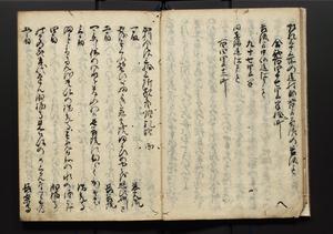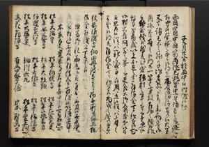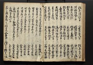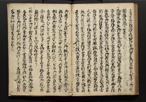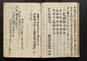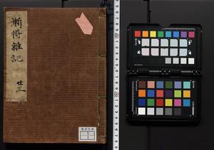 | 解説 | 盛昌座右の雑記録で元禄~享保年間に採録したもの。末尾に2丁を付し「右漸得雑記全部二十六冊旧表紙朱禅寺紙,吾家四世小兵衛盛昌老名西岸大人,在世中座右之雑誌抄録也,蓋元禄・宝永・正徳・享保之年間,所被渉猟之書籍之抄出,或古文書・雑記之写,或故人之伝話,其時々記載焉,其手跡者,長男五世常昌老名定運大人,曁次子勘蔵,三子多四郎,皆未幼年輩,依親父家厳之命令謄写乎,故誤字脱誤不少矣,実吾家伝書中之一部也,但経年暦虫害頗多,且表紙甚破壊,故今自加修繕,改表紙,子孫永世為家珎可令保護者也,明治十年春三月下旬,十世孫紀良見識之」とあり。第1冊表紙に「家伝書」の押紙あり。 |