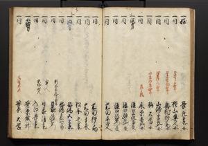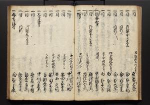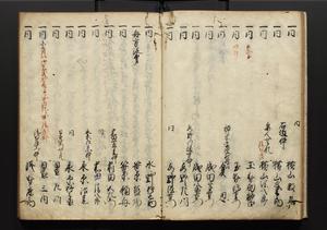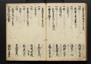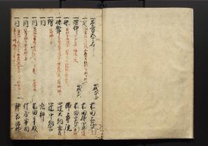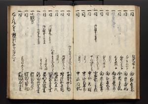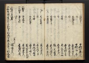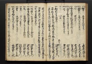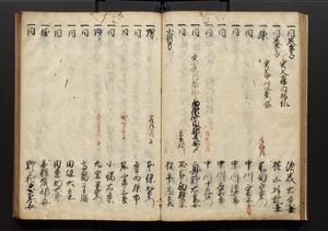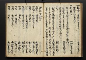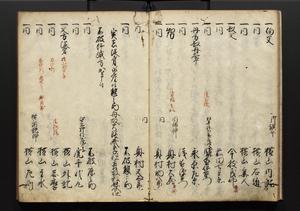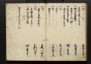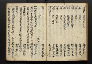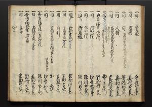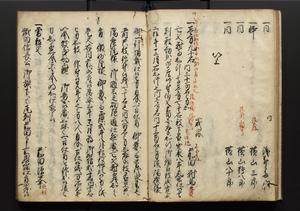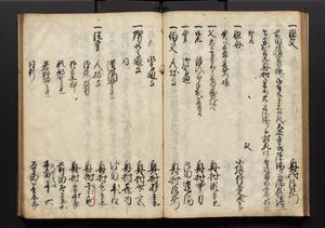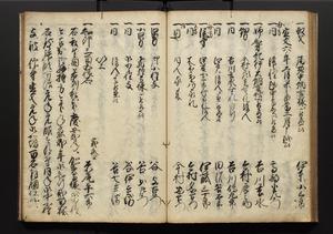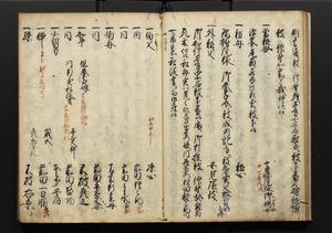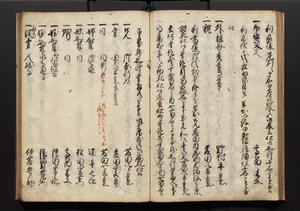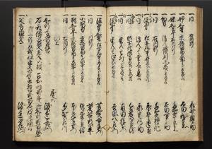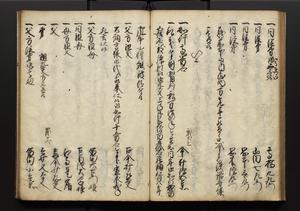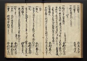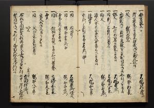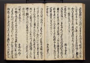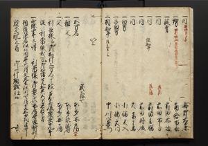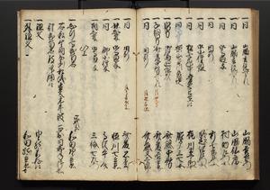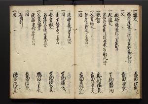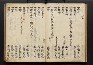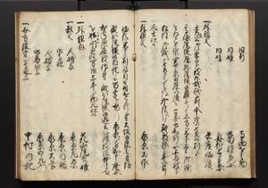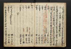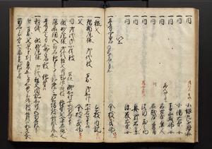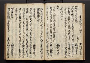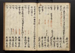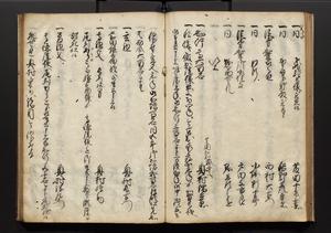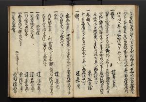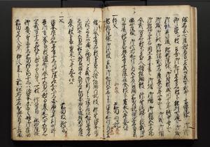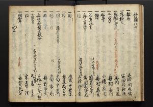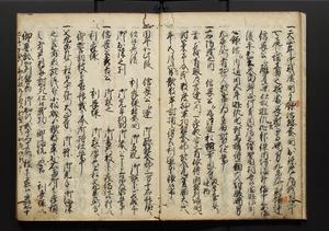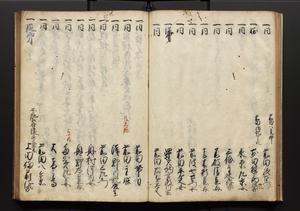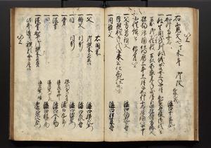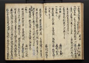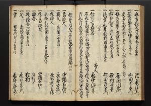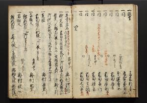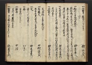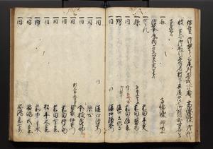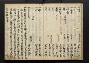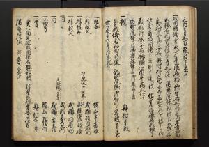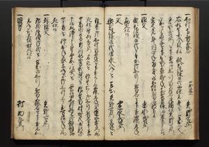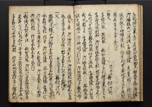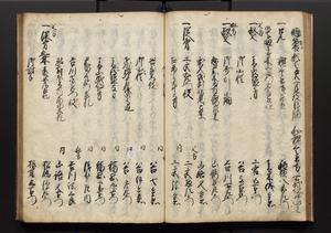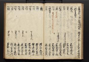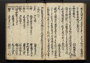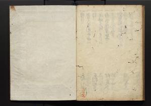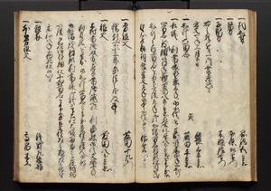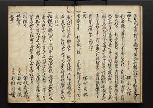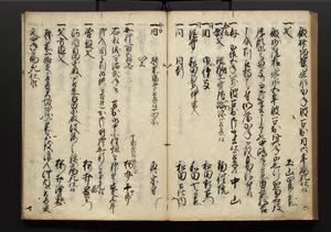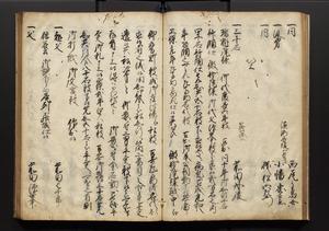 | 解説 | 盛昌座右の雑記録で元禄~享保年間に採録したもの。末尾に2丁を付し「右漸得雑記全部二十六冊旧表紙朱禅寺紙,吾家四世小兵衛盛昌老名西岸大人,在世中座右之雑誌抄録也,蓋元禄・宝永・正徳・享保之年間,所被渉猟之書籍之抄出,或古文書・雑記之写,或故人之伝話,其時々記載焉,其手跡者,長男五世常昌老名定運大人,曁次子勘蔵,三子多四郎,皆未幼年輩,依親父家厳之命令謄写乎,故誤字脱誤不少矣,実吾家伝書中之一部也,但経年暦虫害頗多,且表紙甚破壊,故今自加修繕,改表紙,子孫永世為家珎可令保護者也,明治十年春三月下旬,十世孫紀良見識之」とあり。第1冊表紙に「家伝書」の押紙あり。 |