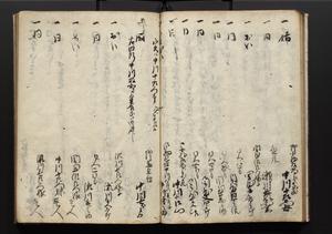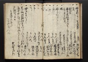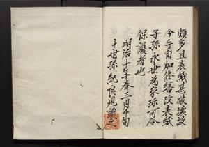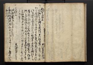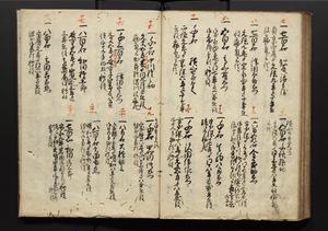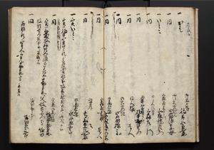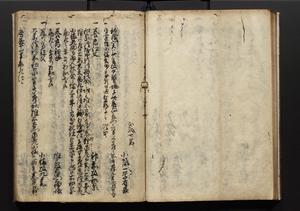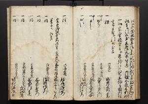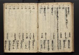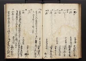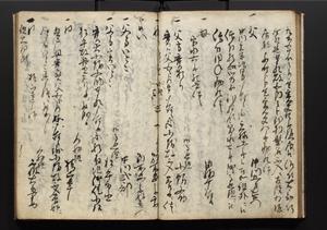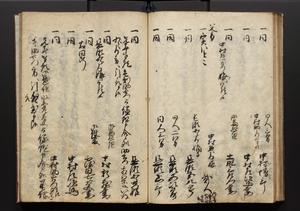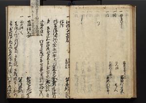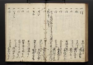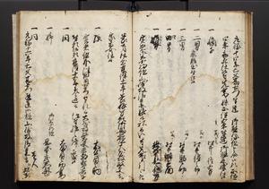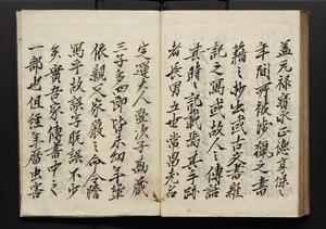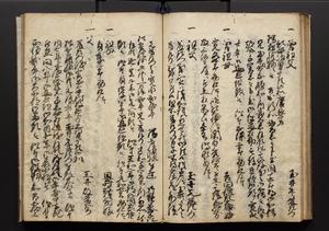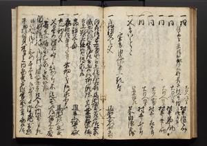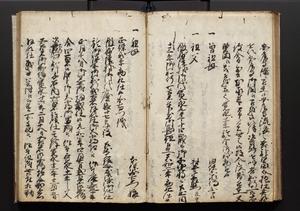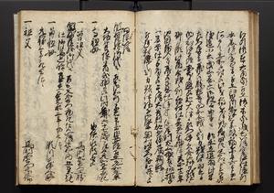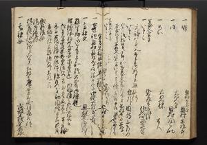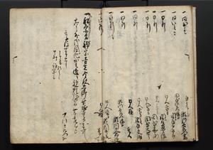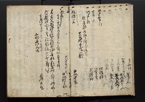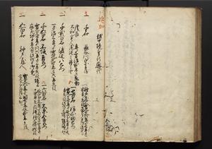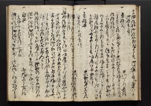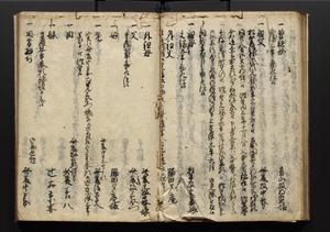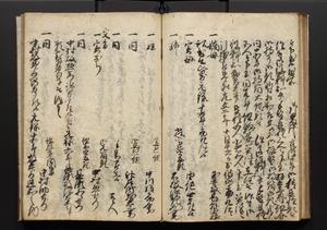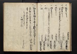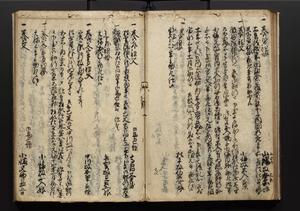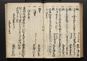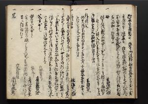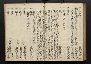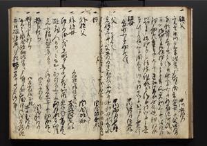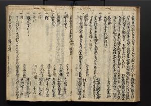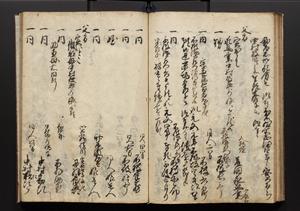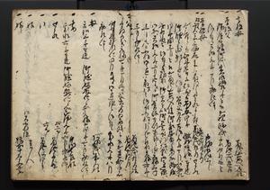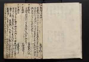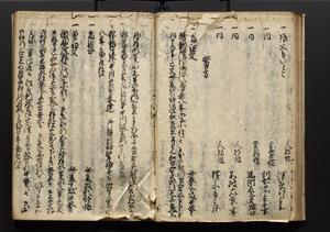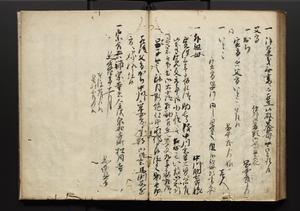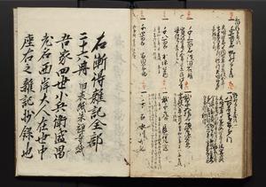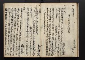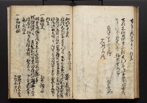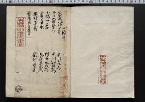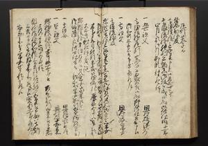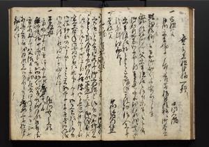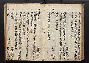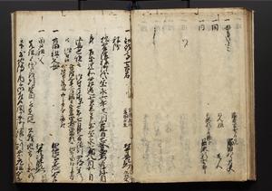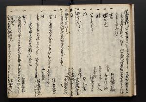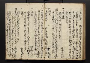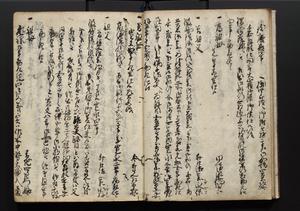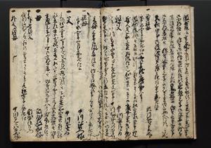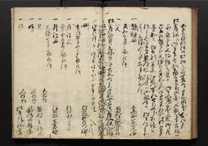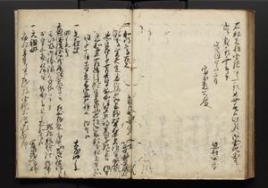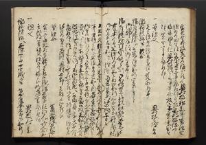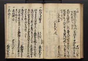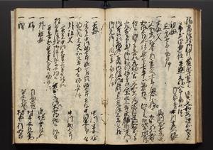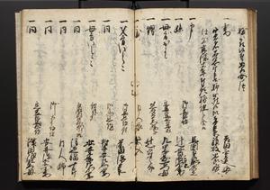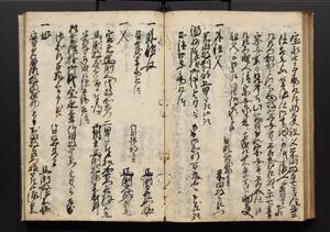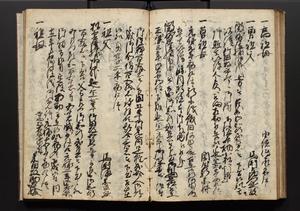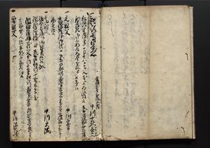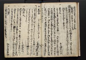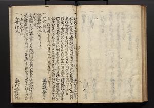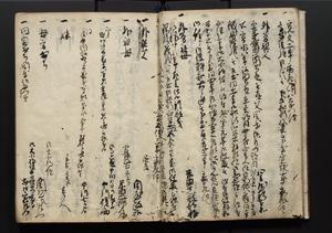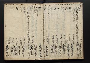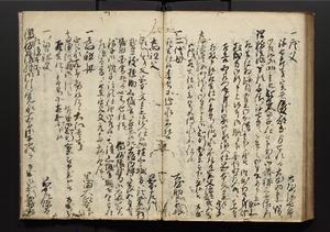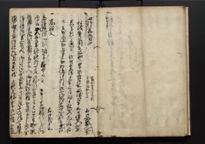 | 解説 | 盛昌座右の雑記録で元禄~享保年間に採録したもの。末尾に2丁を付し「右漸得雑記全部二十六冊旧表紙朱禅寺紙,吾家四世小兵衛盛昌老名西岸大人,在世中座右之雑誌抄録也,蓋元禄・宝永・正徳・享保之年間,所被渉猟之書籍之抄出,或古文書・雑記之写,或故人之伝話,其時々記載焉,其手跡者,長男五世常昌老名定運大人,曁次子勘蔵,三子多四郎,皆未幼年輩,依親父家厳之命令謄写乎,故誤字脱誤不少矣,実吾家伝書中之一部也,但経年暦虫害頗多,且表紙甚破壊,故今自加修繕,改表紙,子孫永世為家珎可令保護者也,明治十年春三月下旬,十世孫紀良見識之」とあり。第1冊表紙に「家伝書」の押紙あり。 |