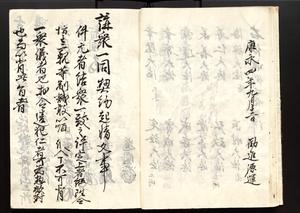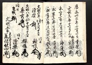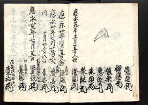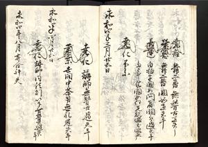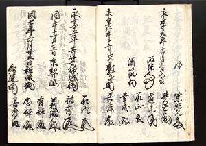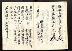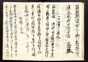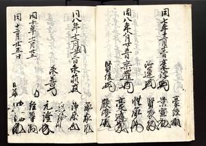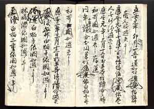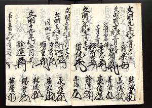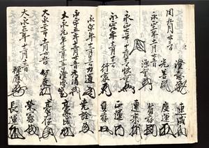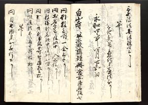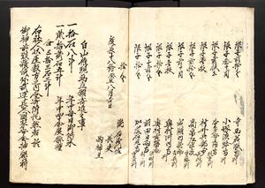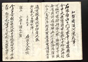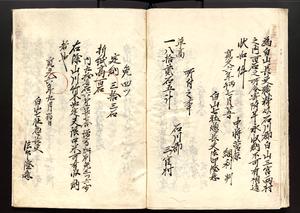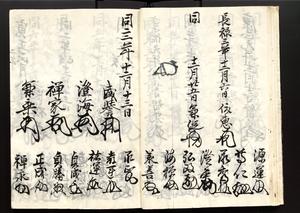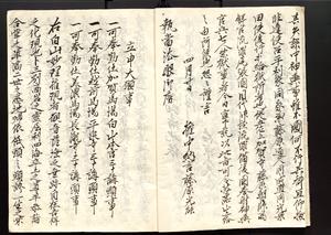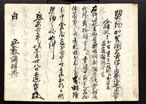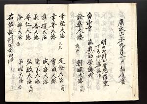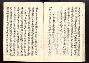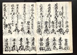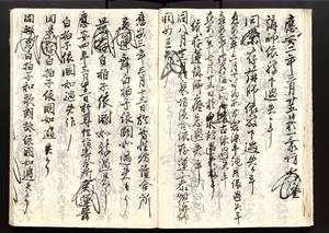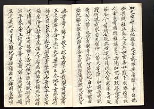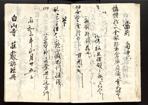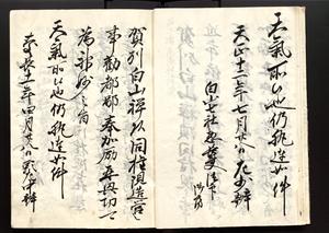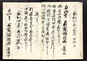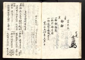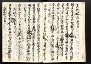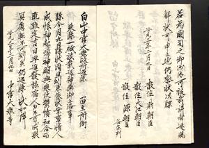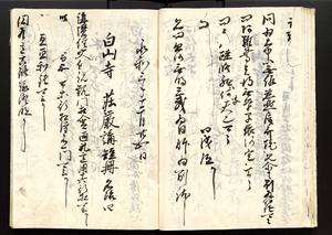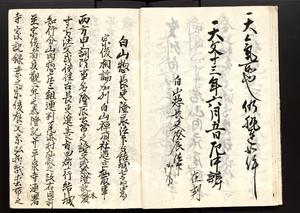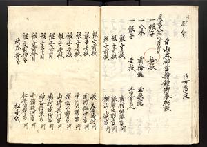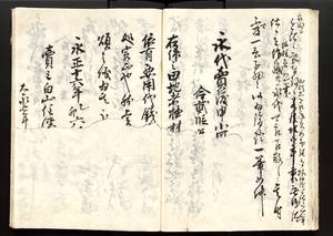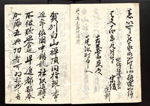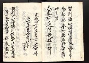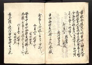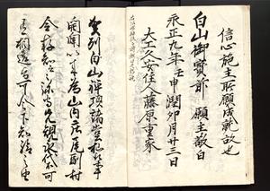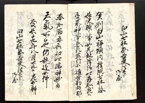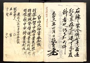 | 解説 | 内扉に「明治二十五年一月写之,于時七十歳,柿園舎主人紀良見輯纂」とあり。白山比咩神社所蔵の古文書等の写。内容は、加賀国留守所牒(安元3年2月9日),白山中宮大衆政所返牒(安元3年2月9日),延暦政所下文(安元3年2月日),白山中宮衆徒等請文(安元3年2月20日),某御教書(3月9日),藤原光能書状(4月20日),源義仲願文(寿永2年5月9日),僧恒盛・真盛連署起請文(元弘3年12月25日),白山宮政所牒案(康永3年3月日、「三宮古記」より),大桑玄猷・同光顕連署田地寄進状案(延文元年6月16日),左衛門尉高直書状案(応安6年10月28日),白山宮水引神人和与状案(文和3年7月18日、「三宮古記」より),御本社并荒御前社遷宮日記写(延文2年11月16日、同年12月20日),井家道者入目之日記(永正6年8月5日写),白山比咩神社々前鰐口銘(永正9年閏4月23日),後奈良天皇綸旨写(天文13年6月5日),室町幕府奉行人連署意見状写(天文14年6月24日),結城宗俊契状写(天文14年9月20日)(以上3通尾添村密谷家文書),正親町天皇綸旨(天正12年7月28日),後陽成天皇綸旨(慶長11年4月28日),後水尾天皇綸旨(慶長19年8月29日),後光明天皇綸旨(寛永21年12月12日),霊元天皇綸旨(寛文6年3月1日),白山本宮荘厳講所挙達状(貞和3年12月3日),白山本宮荘厳講所廻状(康永3年9月12日),白山本宮荘厳講所廻状(康永4年9月12日),荘厳講衆一同契約起請文(延慶3年8月12日),荘厳講衆過失記(延文5年11月24日~永和4年8月),白山荘厳講衆等解(建保4年11月25日),天台座主慈勝御教書案并権律師行澄奉書案(元亨2年6月9日,元亨2年7月),加賀国上林郷内免田坪付(延文元年7月26日),僧妙成田地質券(延文2年3月28日),僧澄全田地避状(貞治6年12月13日),上道氏平契約状案(応安6年11月28日),白山寺荘厳講短冊(永和2年閏7月25日~永和3年12月25日),白山寺荘厳講短冊(永和4年閏4月25日~同年10月25日),僧久成書状(応永9年12月13日),百姓某年貢起請文案(年記不明),僧某田地売券(永正16年6月□□),一和尚乗禅外六名連署田地売券案(弘治3年□□□□),一和尚禅家外三名連署契約状案(永禄2年12月日),白山荘厳講剣数目録(永禄3年正月9日),白山宮奉納御剣添状(寛永5年11月日),古代古神剣審定書(明治15年12月),前田利光判物(寛永5年11月25日),白山本宮本社神前扁額写并裏書(慶長2年7月28日),本地観音堂鐘銘写(元和5年6月吉日),書白山真柄太刀之筺記(寛永5年11月穀旦),白山比咩神社願文(明暦4年正月),軽海郷代官職補任状(天文13年11月3日),豊臣秀吉禁制(天正11年4月日),白山大神宮御奉加帳(慶長11年7月吉日),白山大神宮撞鐘御奉加帳(慶長18年8月吉日),前田利光白山神事料寄進状(慶長16年12月24日),白山社神事料田之諸役米免除ニ付三輪長好書状(元和5年正月28日),前田綱紀白山長吏職料百石寄進状(寛文6年7月25日),前田綱紀白山長吏職料寄進之所付(寛文6年9月1日),前田利長書状(7月6日),前田利常御札巻数返事(9月6日),前田利常御札巻数返事達書(6月15日),前田利常御札巻数返事(正月11日),前田利常御札巻数返事達書(6月17日)。 |