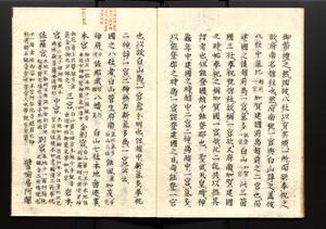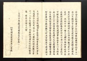 | 解説 | 題簽に「副本」と朱書あり。文化10年正月富田景周が「下白山(現白山比咩神社)神庫秘蔵」本より書写し神庫に納めた本の写。奥書に「此者,弘化五年三月五日同十六日之両日,彼神社に至り長吏澄遥之客殿に於而写畢,森田平丞良見」とあり。良見の朱書入あり。 |