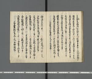 | 解説 | 加賀藩宰領足軽山田四郎右衛門の宝永年間の編纂。鎌倉・室町の簡単な記述から加賀藩の記事となり,前田利常薨去まで記されている。各巻頭に「朱以書入仕事森田小兵衛盛昌如斯」と朱書あり。 |