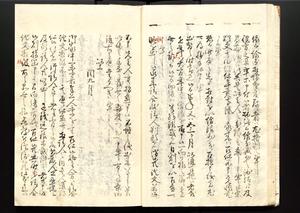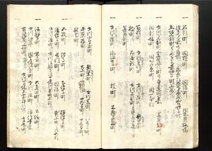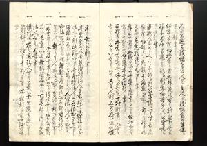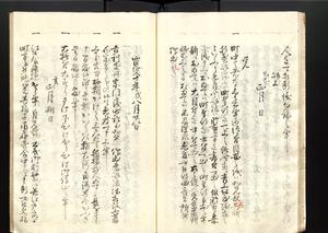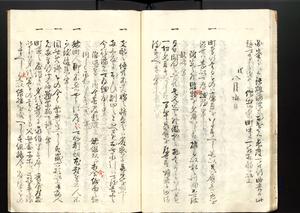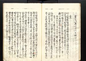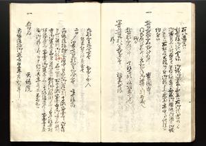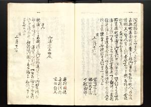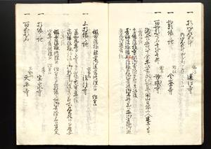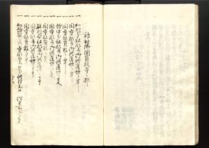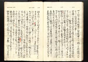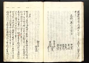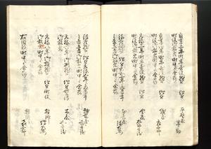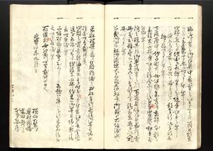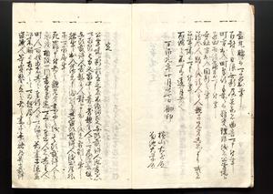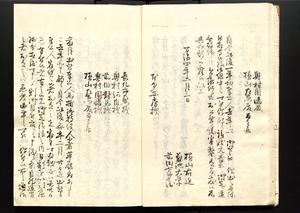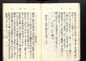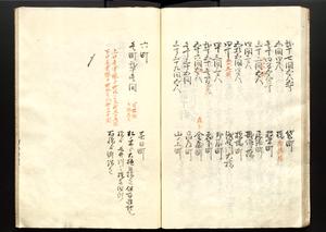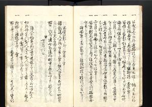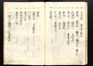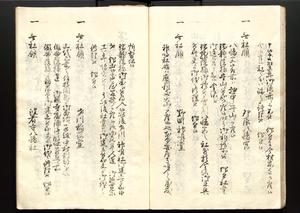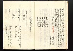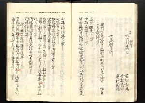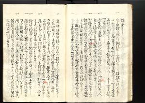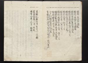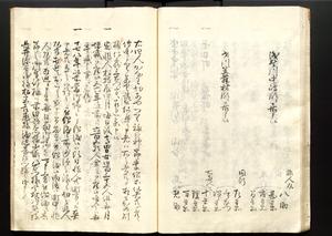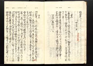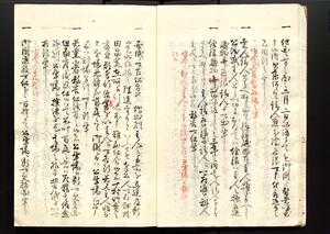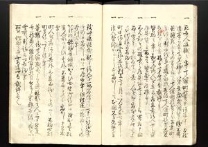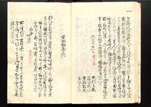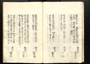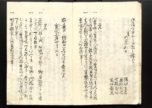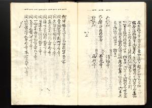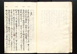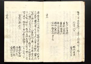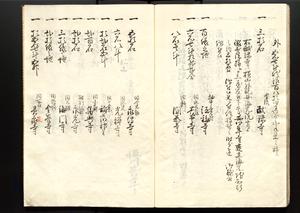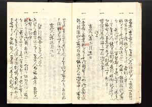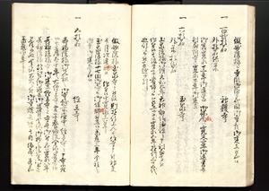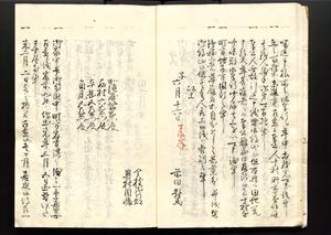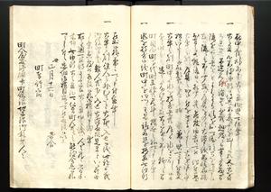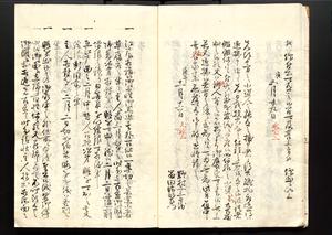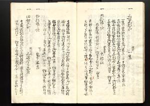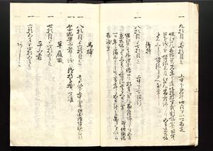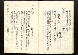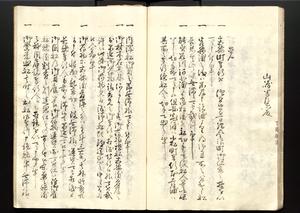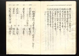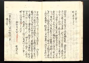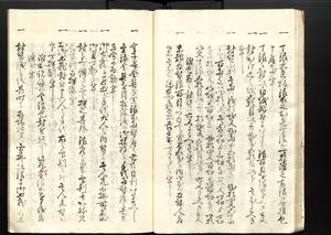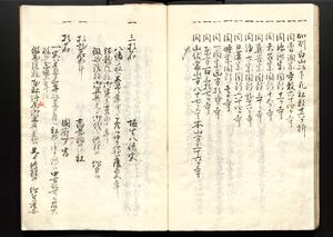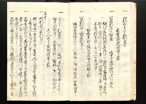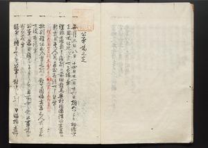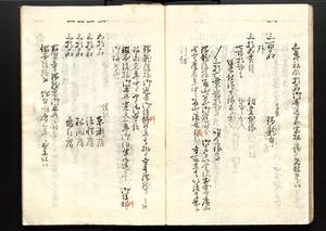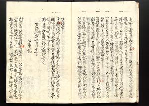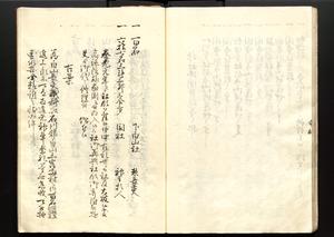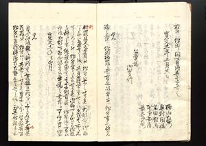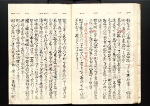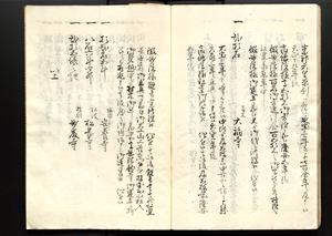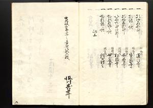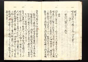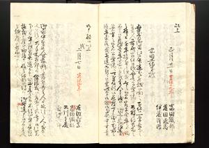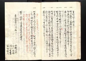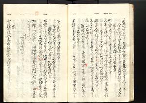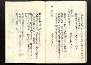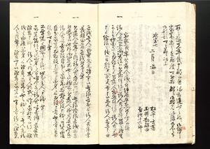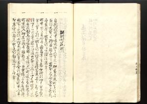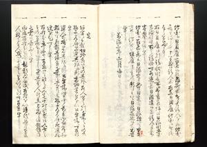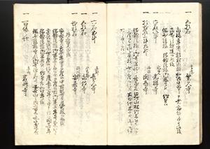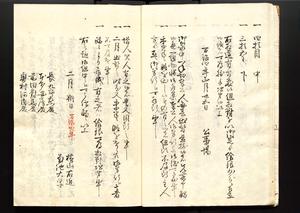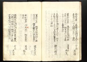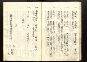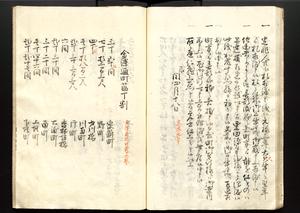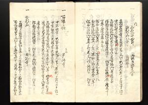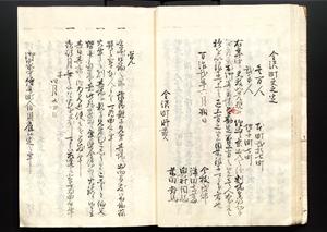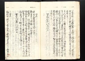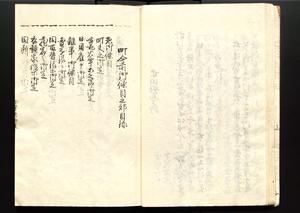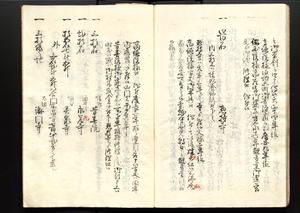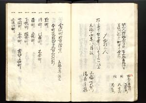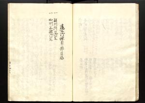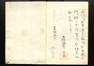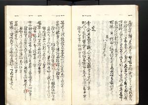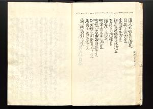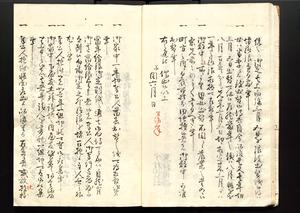 | 解説 | 各冊末尾に「文化二乙丑年孟冬,恒川七兵衛方所持之本,深望而令借用之,秘蔵之畢,屋漏堂長世」と奥書あり。第12冊末尾に「加藩十二冊定書者,旧金沢藩規則書類,従而宝暦・明和年間之人所類聚也,蓋奥書等無之,撰者之姓名不詳云,(中略)此本者,吾藩執政家村井氏八正従五位下豊後守長世主,嘗以恒川寿年之蔵本令謄写云,然処明治維新百事改革之際,規則類之書籍悉呈進,藩庁有之処,無程廃藩置県御発令,依之明治五年正月廿三日於金沢藩庁,以賞詞之書立,旧記類凡二十六筥予頂戴之悉拝領,右書籍悉皆村井氏嘗所呈進之書也,十二冊定書即其一部,而奥書者,則村井氏長世主之自筆也云,明治七年八月,森田平次識」と加筆あり。 |