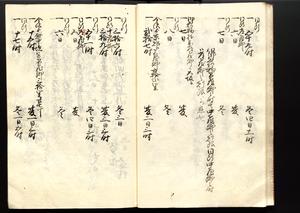 | 解説 | 各冊末尾に「文化二乙丑年孟冬,恒川七兵衛方所持之本,深望而令借用之,秘蔵之畢,屋漏堂長世」と奥書あり。第12冊末尾に「加藩十二冊定書者,旧金沢藩規則書類,従而宝暦・明和年間之人所類聚也,蓋奥書等無之,撰者之姓名不詳云,(中略)此本者,吾藩執政家村井氏八正従五位下豊後守長世主,嘗以恒川寿年之蔵本令謄写云,然処明治維新百事改革之際,規則類之書籍悉呈進,藩庁有之処,無程廃藩置県御発令,依之明治五年正月廿三日於金沢藩庁,以賞詞之書立,旧記類凡二十六筥予頂戴之悉拝領,右書籍悉皆村井氏嘗所呈進之書也,十二冊定書即其一部,而奥書者,則村井氏長世主之自筆也云,明治七年八月,森田平次識」と加筆あり。 |