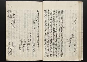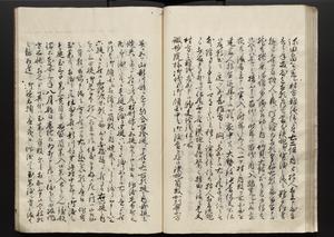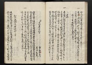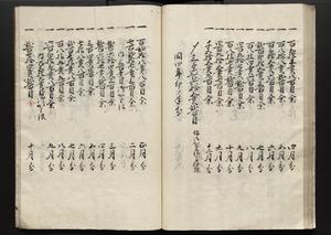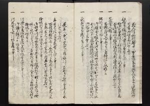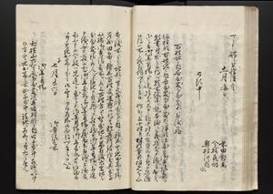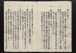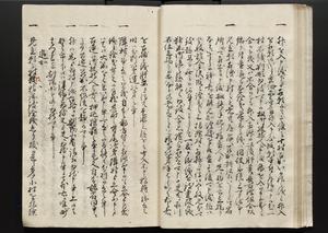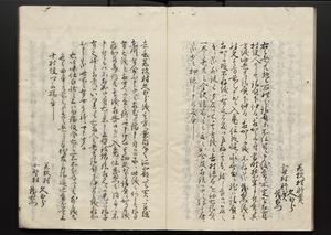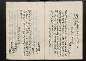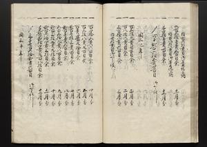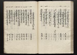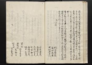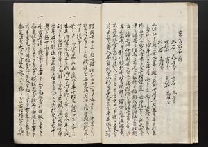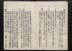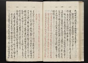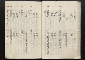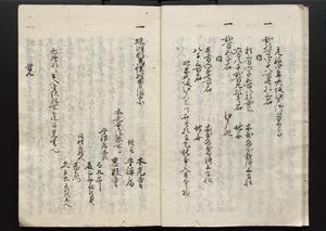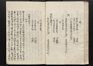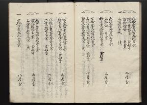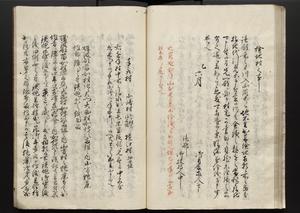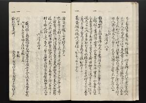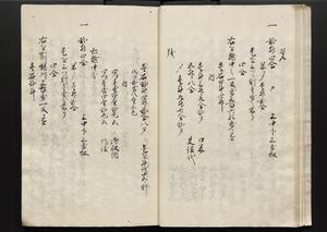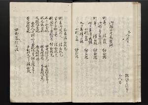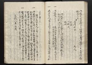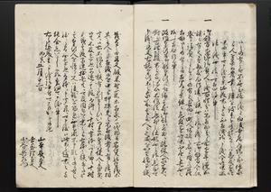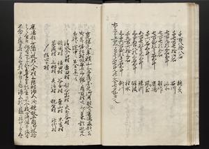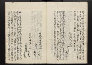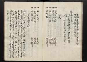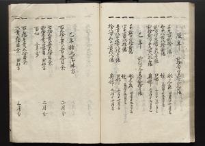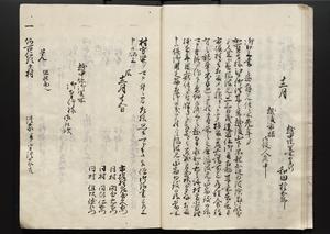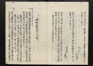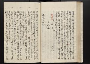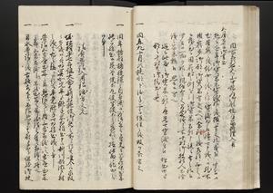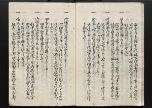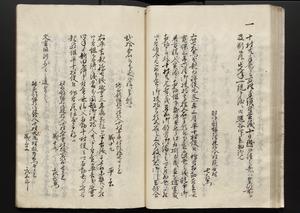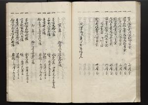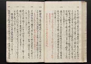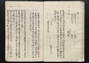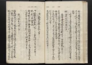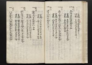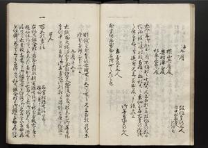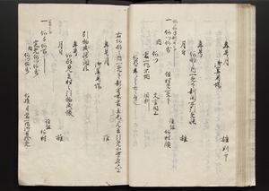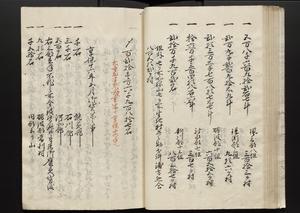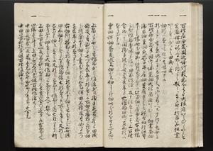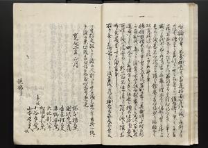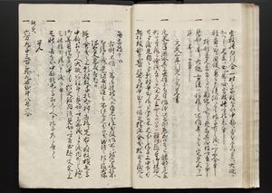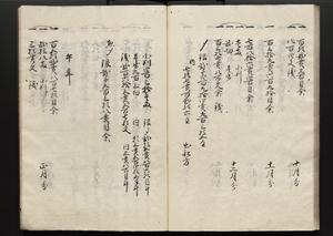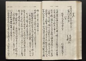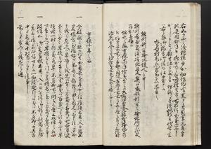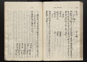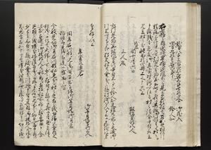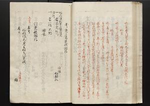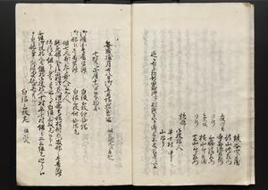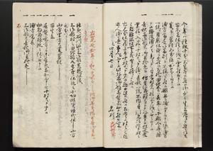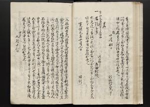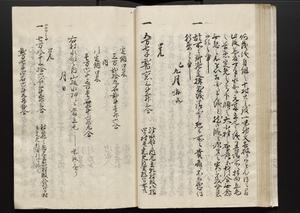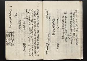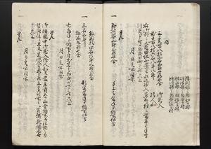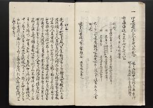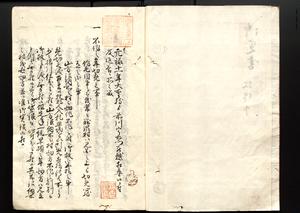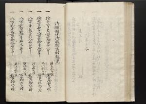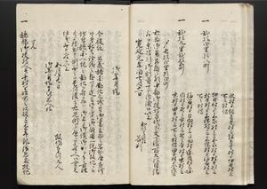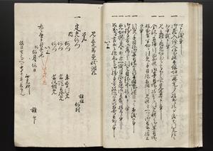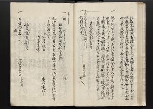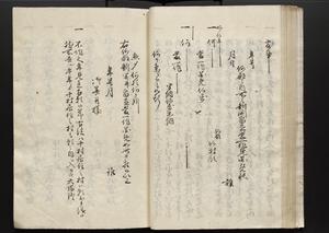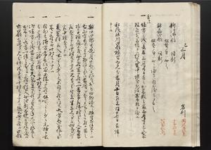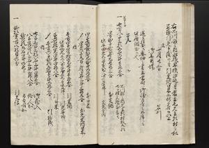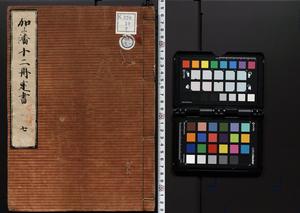 | 解説 | 各冊末尾に「文化二乙丑年孟冬,恒川七兵衛方所持之本,深望而令借用之,秘蔵之畢,屋漏堂長世」と奥書あり。第12冊末尾に「加藩十二冊定書者,旧金沢藩規則書類,従而宝暦・明和年間之人所類聚也,蓋奥書等無之,撰者之姓名不詳云,(中略)此本者,吾藩執政家村井氏八正従五位下豊後守長世主,嘗以恒川寿年之蔵本令謄写云,然処明治維新百事改革之際,規則類之書籍悉呈進,藩庁有之処,無程廃藩置県御発令,依之明治五年正月廿三日於金沢藩庁,以賞詞之書立,旧記類凡二十六筥予頂戴之悉拝領,右書籍悉皆村井氏嘗所呈進之書也,十二冊定書即其一部,而奥書者,則村井氏長世主之自筆也云,明治七年八月,森田平次識」と加筆あり。 |
