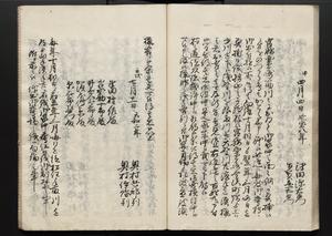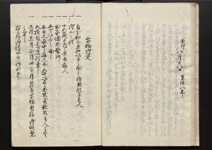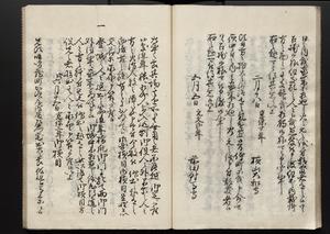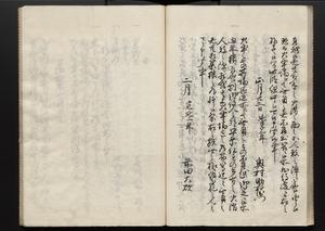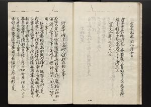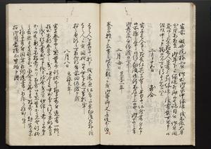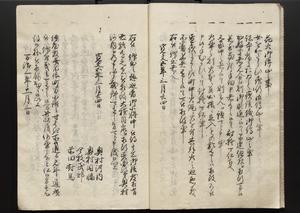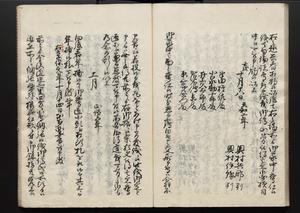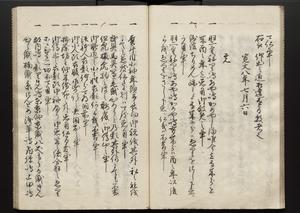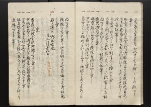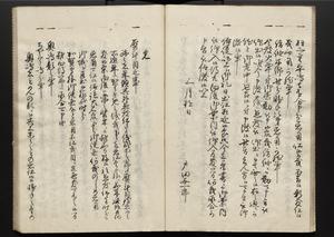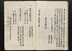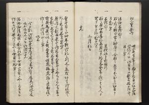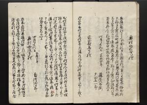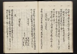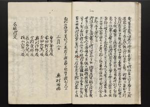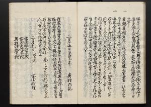 | 解説 | 各冊末尾に「文化二乙丑年孟冬,恒川七兵衛方所持之本,深望而令借用之,秘蔵之畢,屋漏堂長世」と奥書あり。第12冊末尾に「加藩十二冊定書者,旧金沢藩規則書類,従而宝暦・明和年間之人所類聚也,蓋奥書等無之,撰者之姓名不詳云,(中略)此本者,吾藩執政家村井氏八正従五位下豊後守長世主,嘗以恒川寿年之蔵本令謄写云,然処明治維新百事改革之際,規則類之書籍悉呈進,藩庁有之処,無程廃藩置県御発令,依之明治五年正月廿三日於金沢藩庁,以賞詞之書立,旧記類凡二十六筥予頂戴之悉拝領,右書籍悉皆村井氏嘗所呈進之書也,十二冊定書即其一部,而奥書者,則村井氏長世主之自筆也云,明治七年八月,森田平次識」と加筆あり。 |