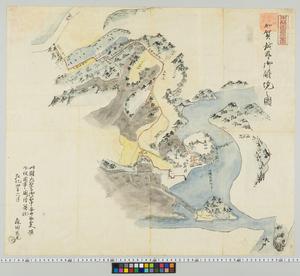 | 解説 | 内題は「加賀越前御領境之図」。奥書は墨筆で「此図,大聖寺御家中安井助太夫撰,今彼図書之図ヲ借写訖,弘化四年六月,森田良見(印●)」記あり。越前領内の方に書入が多く水墨画風。往還より吉崎村までの境は朱線,平地と畑は黄色,田は灰色,樹木は黒色,池と海は青色に彩色。吉崎村,蓮如山,香嶋等は越前領となっている。印記●。 |