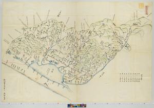 | 解説 | 郡内の5郷5庄名を小判型に入れ,それぞれの記号を付した絵図。内潟(河北潟)と川は淡青色,道は朱線,山は萌黄色,砂浜は淡茶色,樹々は黒色で彩色。端書の郷と庄名の小判型に彩色がなく,未完成の絵図と思える。題簽に「郷庄分」と墨筆あり。印記●。 |