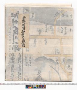 | 解説 | 内題は「加州石川郡石浦郷石浦村長谷寺敷地往古伝来氏子土地七ケ村,石浦村,笠舞村,保島村,朱免野村,山崎村,今市村,木新保村写絵図」。奥書は墨筆で「右石浦山王産土図以慈光院所蔵之古図模写之畢,安政弐年五月 柿園良見(印●)」と記あり。左上に朱筆で「書添也」。墨筆で「寛政十一年二月,十二代現住宗覚裏打修理為后世也」と記あり。端書に「良見按,此図伝説云寛永八年之製図,蓋誤伝也(中略)今按,元禄以後享保以前拠社殿之旧記等筆記之為掛額,後破損,寛政十一年加裏打修理為社蔵者也」「此絵図者石浦神社々蔵之写也(中略)金沢市中之珍図也,故今為裏打伝于子孫者也,明治三十三年五月十二日誌」と朱筆あり。石浦山長谷寺(屋根と柱は茶色)を中心に描き,石浦郷は白地,他の郷(3ケ所)と庄(1ケ所)はそれぞれ薄く彩色。浅野川・才川・大野用水は青色,道筋は黄色。樹木は緑色に彩色。藩士・町村・寺社・坂・橋・川・堀・用水等の名前を詳細に書入。印記●。 |