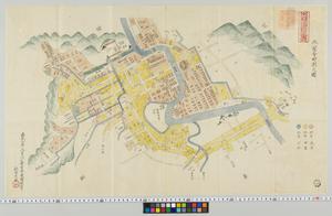 | 解説 | 内題は「大聖寺町割之図」。奥書は墨筆で「嘉永七年十一月,以小倉有年蔵図模写,森田良見(印●)」と記あり。藩主の居舘,社寺,町名,橋,関所等を記した絵図。武家は茶色,町屋は黄色,寺社は白色,川は青色,道は白色,山は緑色に彩色。印記●●。 |