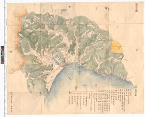 | 解説 | 「上」は能登の国に接した「氷見の庄」,「下」は婦負郡に接した「高岡の庄」の絵図。内題は「射水郡絵図」。「上」の奥書は墨筆で「弘化四年五月写之,森田良見」。「下」は「弘化四年五月写之,森田与志見」。用水を中心に描いた明細図で,「御普請」「自普請打掛」「打銀」「掛樋」等の区別の記あり。道は朱線,海・川・潟・用水江堤は青色,山は萌黄色,御廟所寺社門前地町御支配所は灰色,石動山境并婦負郡御領塚境は黄色,砺波郡境は茶色,射水郡内は白色で彩色。射水郡内の村名は長方型の中へ,婦負郡内の村名は小判型の中へ記し,各庄の記号を付す。古城跡と御収納御蔵所も記号で明示。題簽は朱筆で「珍図也」,墨筆で「二枚ノ内」と記あり。印記●●。 |