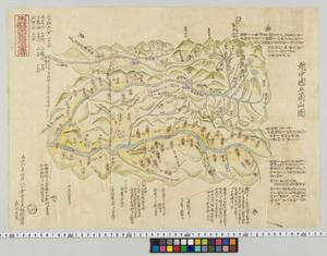 | 解説 | 奥書は墨筆で「嘉永六年正月,以小倉有年之秘図模写,森田良見(印●)」記あり。五ケ山五谷は赤尾谷14村,上梨谷7村,下梨谷12村,利賀谷18村,小谷19村の70ケ村。川は青色,橋は黄色,道は朱線,平野は黄色,山は萌黄色で彩色。村々の内大牧先組は茶色の小判型,岩淵先組は白抜の小判型,御鷹巣原山は白抜の長方型内に記入。印記●。 |