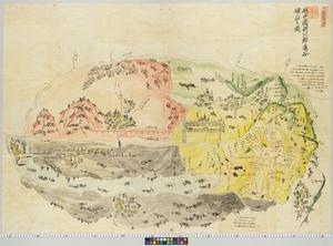 | 解説 | 絵図の中央東から西に亀谷川が流れ,向い合って村や山を描く。東北の下木宮村・本宮村・原村峰村は緑色,東南の亀谷と山は黄色,西北の小見村と山は赤色,西南の中地山村,和田村・水次村と山は灰色にそれぞれ彩色。色の区別の説明はない。各村に人家,中央に宮を詳細に記載。端書に亀山奉行と郡奉行の記あり。印記●。 |