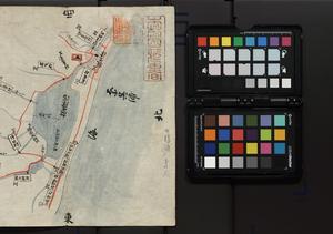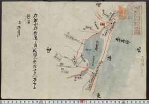 | 解説 | 奥書に「右射水郡絵図之内堀岡又新村書上指上申候絵図」記あり。宛所,指出者の記はなく控とも思える。奈呉浦に面する放生津潟とその支流を青色で,道を朱色,村名は白抜の長方形の中に記されている。放生津潟の中央に築嶋をなし「宮」を建立。奈呉浦は放生津浦の古称。題簽に朱書で「古写」とあり。印記●。 |