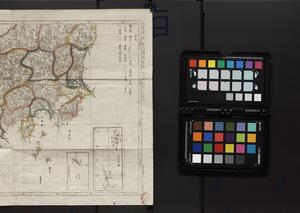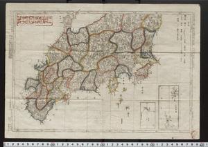 | 解説 | 内題は「小学必携袖珍日本図」。第一図 東山道半,越後半,佐渡,北海道千島之内七郡。第二図 畿内,東海道,東山道,北陸道,紀伊,小笠原島。第三図 山陰道,山陽道,南海道,西海道,琉球諸島。第四図 北海道。発弘書肆:加賀国金沢堤町中村喜平,安江町近田太平,南町野畠信吉。県境は彩色。印記●●。 |
