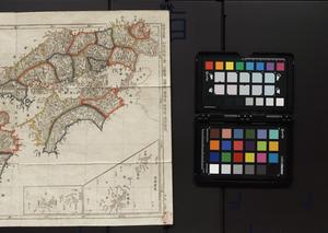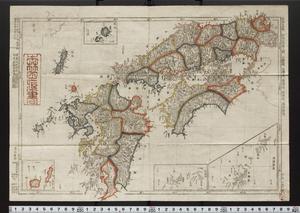 | 解説 | 内題は「小学必携袖珍日本図」。第一図 東山道半,越後半,佐渡,北海道千島之内七郡。第二図 畿内,東海道,東山道,北陸道,紀伊,小笠原島。第三図 山陰道,山陽道,南海道,西海道,琉球諸島。第四図 北海道。発弘書肆:加賀国金沢堤町中村喜平,安江町近田太平,南町野畠信吉。県境は彩色。印記●●。 |