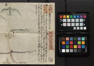 | 解説 | 内題は「江沼郡馬場村領旗降山之図」。奥書は墨筆で「弘化三年初冬,宮永無勇」,朱筆で「此図,大聖寺宮永氏所造也,今彼家●借得て写之,弘化四年六月,森田良美」と記あり。馬場村と二梨村,粟津村と那谷村が交差する小橋より旗降山を見た略図。山は淡青色,人家は黄色,道は茶色,川は青色,橋は朱色で彩色。端書に旗降山についての由来の記あり。印記●。 |