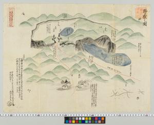 | 解説 | 内題は「鞍ケ嶽之図」。奥書は「右嘉永七年三月十三日,以奥村氏之家臣辻氏之蔵図模写之,森田与志美(印●)」と記あり。鞍ケ嶽の麓,嶽村より鞍ケ嶽の山並(萌黄色)までを画き,途中に本丸と二ノ丸跡,大池・小池(青色),それに大門前より村へ通じる道(朱線)を記す。端書に「原図付札,小幡親久子与沼田庄蔵秀友登山,延享八年五月四日也,安永二年四月七日予与岡嶋一寧子小幡親久子登山ス,此図親久子家蔵之図ヲ以テ写之,平匡之」と記あり。印記●。 |