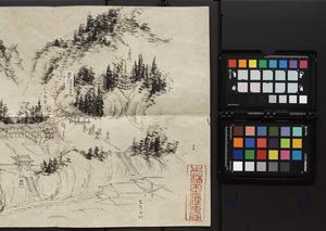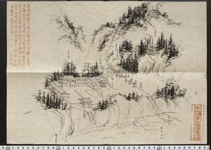 | 解説 | 標高約28cmに在する本堂を中心に,左に日石寺,右に三重塔を高い位置より描いた墨絵。大岩山は『日本地名大辞典 富山県』に「聖域天皇天平二年に日石寺が建立されて以来著名になり,一時は60余りの坊舎を有し,隆盛を極めたと伝えられている。」と記あり。端書に朱筆で「起中国新川郡大岩山者,当国之名区不動明王之霊威天下著明也,明治二十年五月二十三日男外与吉同僚与二村氏至于此拝霊像,同夜宿于上市邑於旅泊倉卒図之云爾平次誌」記あり。印記●。 |