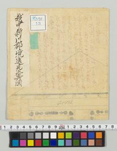 | 解説 | 内題は「越中境御亭山之高遠見御番所之図」。二枚の紙を貼付し,前半分に絵図あり。越中境御亭山をさらに登った処に建っていた遠見御番所の図。図の下に墨筆で建物についての説明,上部に朱筆で「寛保二年二月十七日大風ニ而吹潰,境奉行津田右膳●其段御達申処(中略)四月二十一日,御用番安房守殿●被仰渡,此図ハ右御尋之節指出候扣之由」「此後宝暦十二年四月,御囲山御物見有合之材木ヲ以,軽形出来方之義伺ニ相成処,早速出来可申付旨被仰出由,時ノ奉行岩田伝左衛門之書面ニ見ユ」と記あり。後半分には墨筆で,御亭山と高見番所についての所 |