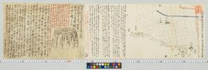 | 解説 | 右半分は富塚村領内のオユリノ神ノ森・椀カシノ神ノ森・矢留メ塚・石槨ヲ埋シ塚の位置図である。奥書は朱筆で「此図大聖寺之家中宮永氏所写之図也,今彼家●借得て写之,弘化四年六月下旬 森田良見(印●)」記あり。墨で個々の塚と神についての説明あり。後に紙を貼付し,富塚の邑名についての所見と,『江沼郡誌』『苃憩紀聞』「宮永理兵衛筆記」を引用して柿園の考証の記あり。印記●。落款●。 |