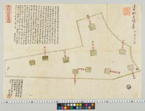 | 解説 | 内題は「浅井畷古墳之図」。奥書は墨筆で「此図吾懇友下田守直之所蔵也,其書体紙面実古図也,今肉書之通騰写畢,嘉永五年二月十九日 紀良見(印●)」記あり。慶長5年8月9日,浅井畷の戦にて戦死した長連竜の臣九士の墓碑を画いたもの。端書に良見の考察の記あり。9人の武将とは「小林平左衛門秀備」「堀内一秀軒」「鹿嶋地六左衛門」「八田三郎」「鈴木権兵衛」「岩田新助」「沖角右衛門」「柳田喜平次」「長中務」(良見の記より)。題簽に朱筆で「三枚ノ内,外合戦図二枚」と記あり。合戦図二枚はNo.379にあり。印記●●。 |