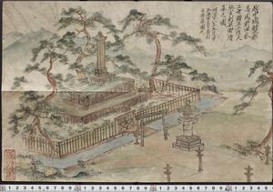 | 解説 | 内題は「越中国射水郡高岡前田家二世贈正二位大納言利長卿墳墓之図」。続けて「明治十八年五月男外与吉至于高岡拝墳墓図之」記あり。御墓と周りの木々,栅,堀,鳥居,石灯籠を描いた密画。御墓は,瑞竜寺の東八町ばかり隔てた所にあり,正保2年の建設で,翌3年の利長33回忌に間に合わせるために築造されたものと『高岡市史・中巻』に説明あり。印記●。 |