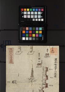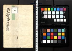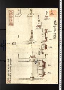 | 解説 | 妙成寺の伽藍(茶色)配置図で,嘉永7年4月20日良見が妙成寺の僧に案内してもらって画いたもの。仏閣名はその僧の説明によってつけられたと奥書にあり。妙成寺は日蓮宗に属し,金栄山と号する。印記●。落款●。 |
