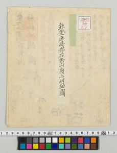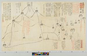 | 解説 | 内題は「能登国石動山神社仏閣之図」。奥書は墨筆で「右石動山ノ図ハ嘉永七年五月八日,能登遊歴ノ際登山シ,二宮神官船木氏ト共ニ山内福智院ニ止宿シ,住僧及船木氏ノ説ヲ聞取,且同日船木氏ト共ニ登山神拝ノ際略方位ヲ図スル者也,森田良見識之(印●)」記あり。石動山五社権現(大宮・白山宮・火宮・梅宮・剱宮)を中心に,左下に仁王門,右に諸堂を描いた図で,登山道と下山道を点線で明示。それぞれの道程は端書にあり。朱筆は,明治7年に森田良見が書き加えたもの。印記●。 |