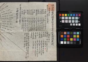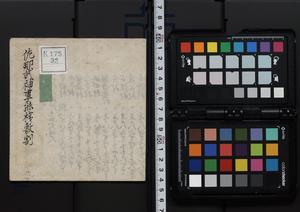 | 解説 | 内題は「寺中佐那武神事能産子二十五ヶ村見物桟敷割」。奥書は朱筆で「嘉永七年十一月十二日夜写之,但寺中河崎氏ヨリ借用之(印●)」記あり。慶長9年より続いている佐那武神事能の桟敷を,享保16年4月の割方を前方に,「今時割付方之図」を後方に図示したもの。印記●。 |