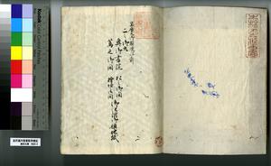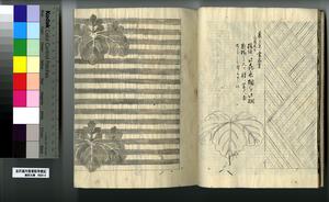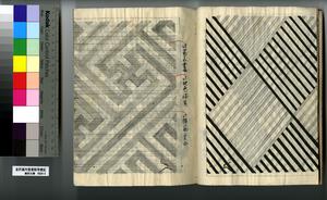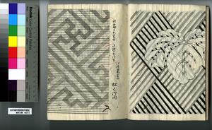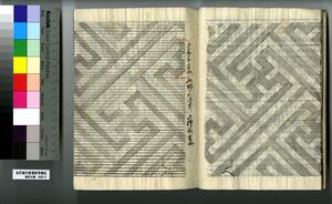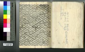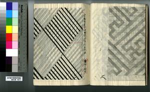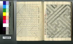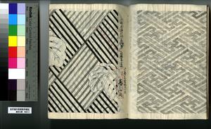 | 解説 | 内題「宝暦九御類焼以前,二之御丸奥御書院・松之御間・蔦之御間・檜垣之御間御張附御襖地紙」。襖紙の柄を描いたもので,彩色はせず,墨の濃淡で表したものに,色名を注記する。奥書に「右奥村助右衛門為質公方ニ有之,則借用而墨写せしむ,文化五年八月,村井又兵衛長世」とあり。印記●●。(屋)。 |