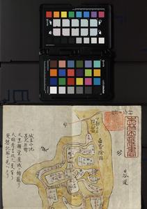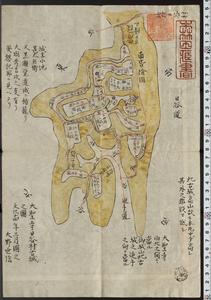 | 解説 | 日谷村の東にある堡跡の絵図で,道筋は朱線,郭は白色,周りは黄色で彩色。端書に「城主小池甚太兵衛又黒瀬覚道,俄ニ楯籠リ大閤秀吉之事有リ,苃憩紀聞ニ見ヘタリ」。右下に「此古城高山故ニ本丸中デ高シ,其外之郭段々低シ」「大聖寺西北之間ニ当ル,御城山此古城之追手之向ニ当ル」と墨記あり。印記●●。 |