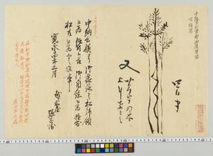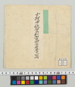 | 解説 | 内題は「中納言利常卿御直筆写,但縮写」。奥書は朱筆で「右利常卿御直画,堤町片岡孫兵衛所蔵為懸軸有之,明治二十二年九月二十六日於彼自宅模写之,森田平次誌」記あり。細い松3本を墨で描く。絵の横に朱筆で「上包書添也」。続いて墨筆で「中納言様ヨリ御露路之松拝領被為仰付帳節,御自絵被為遊,則松共被為下之候事,寛永十四年三月越前屋孫兵衛」記あり。印記●。 |