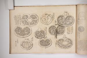 | 内容 | 遠近国(遠江国ヵ)榛原郡初倉村字牧ノ内発掘ノ馬具二種 忍冬ト雲トヲ流暢ニ組合セタルモノ、小サキ丸ニテ広キ空所ヲ埋ムルコトハ推古期ニモ盛ニ用ヒラルル手法ナリ 筑後国八女郡□田(吉田ヵ)発掘ノ馬具 駿河国富士郡大宮町字別所発掘ノ馬具 三河国渥美郡磯辺村発掘ノ馬具(二種) 伊勢徴古館蔵、馬具二種 下図ハ鳳凰ト忍冬唐草トヲ巧ミニ組ミ合セタルモノ、鳥ノ形ハ全ク推古式ニシテ顔ハ温和ニ尾ハ翼ノ如ク延ビタリ、奈良朝ニナレバ忍冬ノ代リニ花又ハ紐ヲ□(嘴ヵ)ヘタル花喰鳥ト云フモノアリ、コレハソノ根元ナルベシ 常陸国新治郡発掘ノ馬具 |