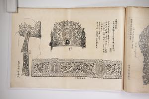 | 内容 | 法隆寺金堂 本彫彩色観世音菩薩立像宝冠及ビ鐶釧(ウデワ) 正面縮図 腕輪ノ金具実大 紐金物 文字情報あり |