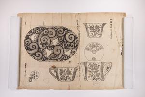 | タイトル | 柘榴模様茶器図案|波ニ千鳥模様丸形花瓶図案 |